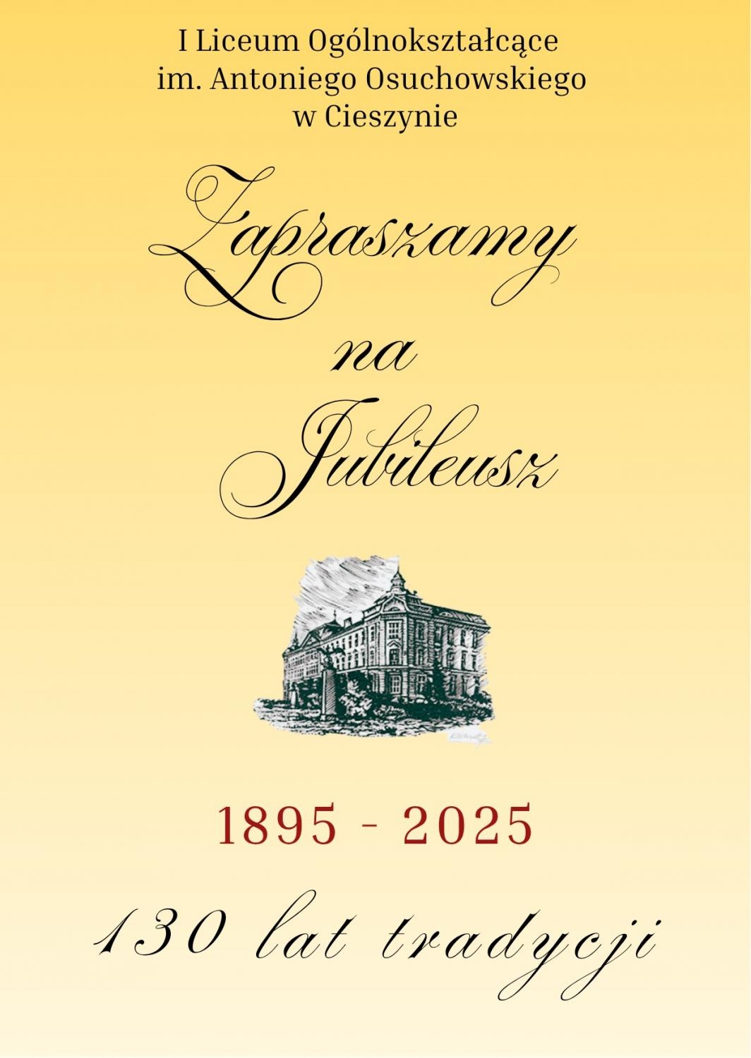W roku szkolnym 2025/2026 I Liceum Ogólnokształcące im. Antoniego Osuchowskiego w Cieszynie obchodzić będzie jubileusz 130 lat swojego istnienia. W ciągu tych lat nasza szkoła, w różnych formach organizacyjnych, odgrywała ważną rolę w życiu lokalnej społeczności. Dumni z pracy pedagogów oraz osiągnięć naszych uczniów i absolwentów, zapraszamy do włączenia się w obchody jubileuszu. Ramami obchodów będą daty początku i zakończenia roku szkolnego 2025/2026, a datami głównych uroczystości będą 24.10.2025 r. i 12.06.2026 r.