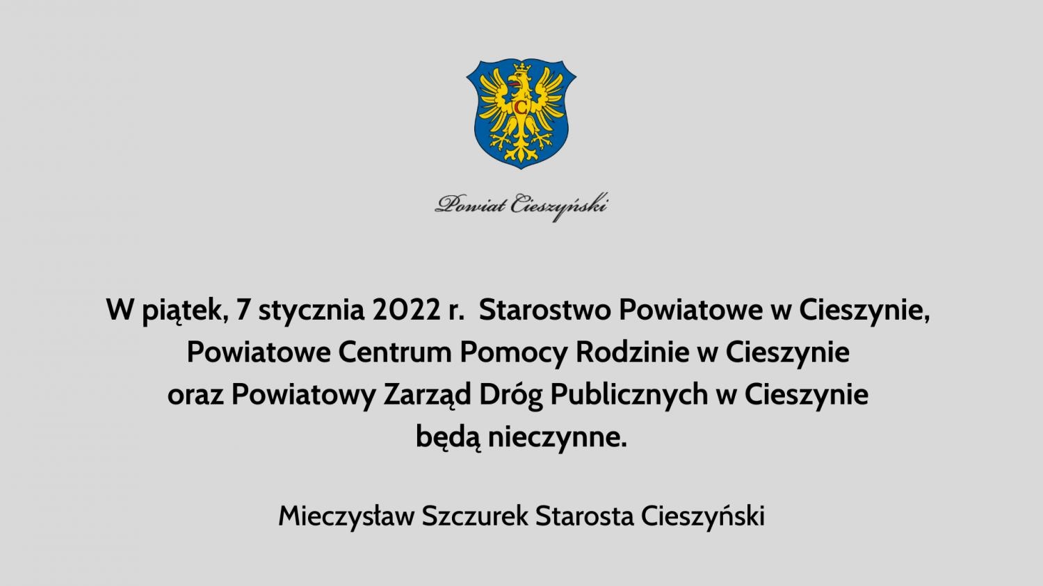 W piątek, 7 stycznia 2022 r. Starostwo Powiatowe w Cieszynie, Powiatowe Centrum Pomocy Rodzinie w Cieszynie oraz Powiatowy Zarząd Dróg Publicznych w Cieszynie będą nieczynne.