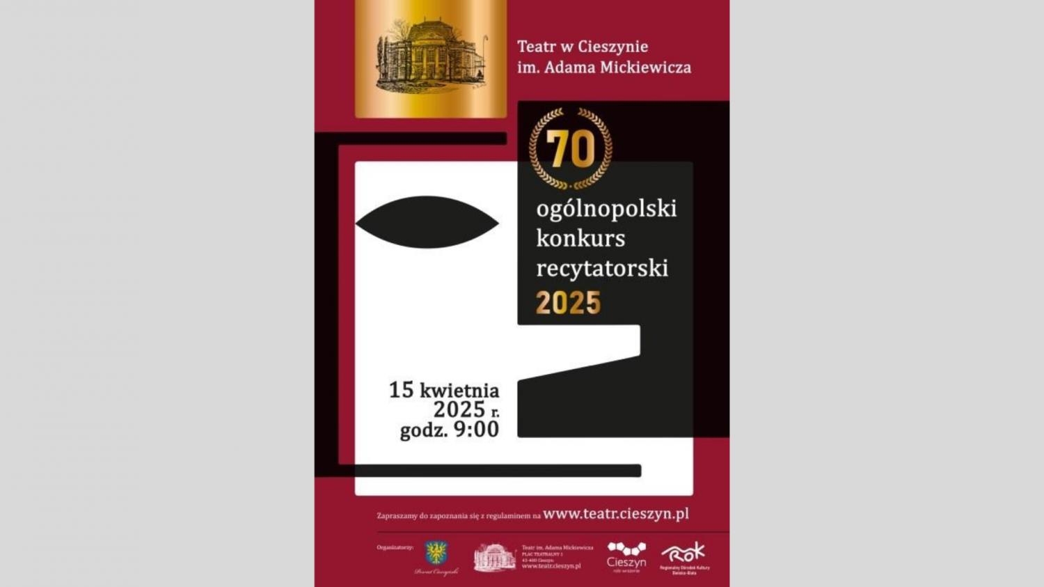 15 kwietnia 2025 r. o godz. 9:00 w Teatrze im. A. Mickiewicza w Cieszynie odbędą się eliminacje powiatowe jubileuszowego 70. Ogólnopolskiego Konkursu Recytatorskiego – najstarszego i największego konkursu recytatorskiego w Polsce.