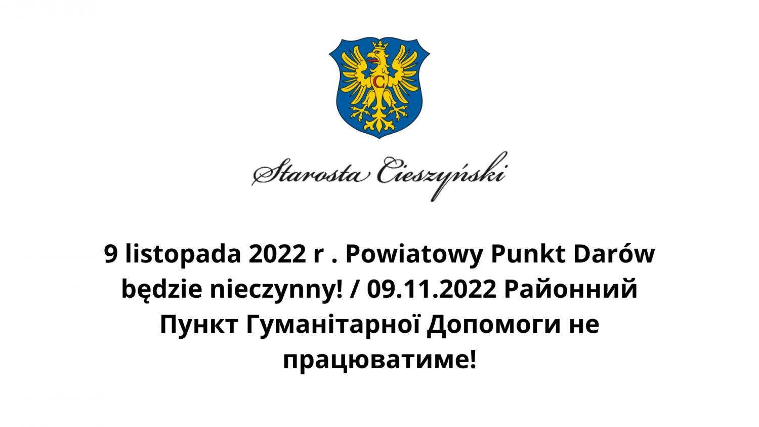 9 listopada 2022 r . Powiatowy Punkt Darów będzie nieczynny! / 09.11.2022 Районний Пункт Гуманітарної Допомоги не працюватиме!