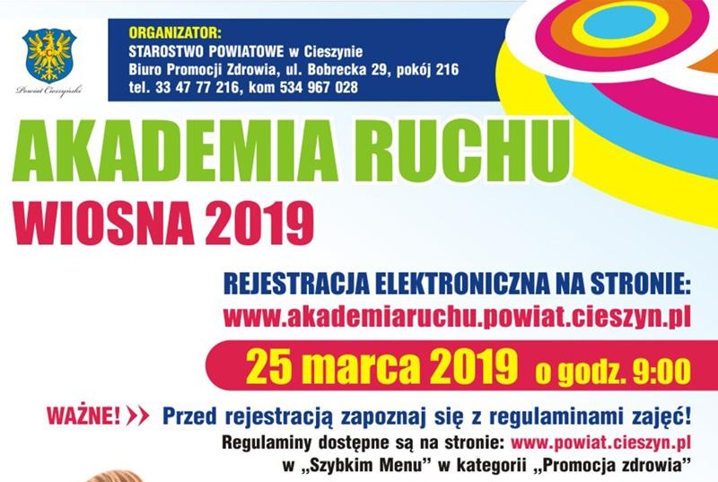 W dniu 25.03.2019r. (poniedziałek) od godz. 9.00 odbędzie się rejestracja na wiosenną edycję „Akademii Ruchu” na stronie: www.akademiaruchu.powiat.cieszyn.pl.