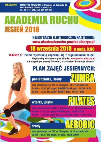 Ruszyła jesienna edycja zajęć ruchowych w ramach programu pn.: „Akademia Ruchu”. Aktywność fizyczna jest nieodłącznym atrybutem życia człowieka, a odpowiednio dobrana do wieku, sprzyja zachowaniu zdrowia. Od kilku już lat podejmujemy aktywne działania dla mieszkańców powiatu w obszarze aktywności fizycznej. Zajęcia nasze nie tylko poprawiają zdrowie i samopoczucie, ale są ciekawym i efektywnym sposobem spędzania wolnego czasu. Zajęcia odbywać się będą wg planu pod okiem uprawnionych intruktorów, a nadzór z ramienia organizatora pełnić będzie Barbara Kłosowska Kierownik Biura Promocji Zdrowia starostwa.