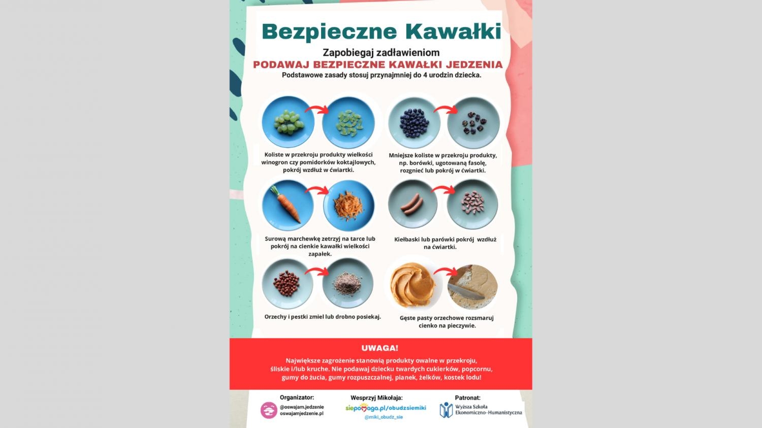 Plakat akcji #AkcjaBezpieczneKawałki jest idealny do powieszenia w szatni żłobka czy przedszkola. Jest genialną ściągą dla zabieganych rodziców. Wystarczy jeden rzut oka, by poznać bezpieczniejszą formę podania produktów żywieniowych, które podane w nieodpowiedniej formie mogą doprowadzić do zadławienia."