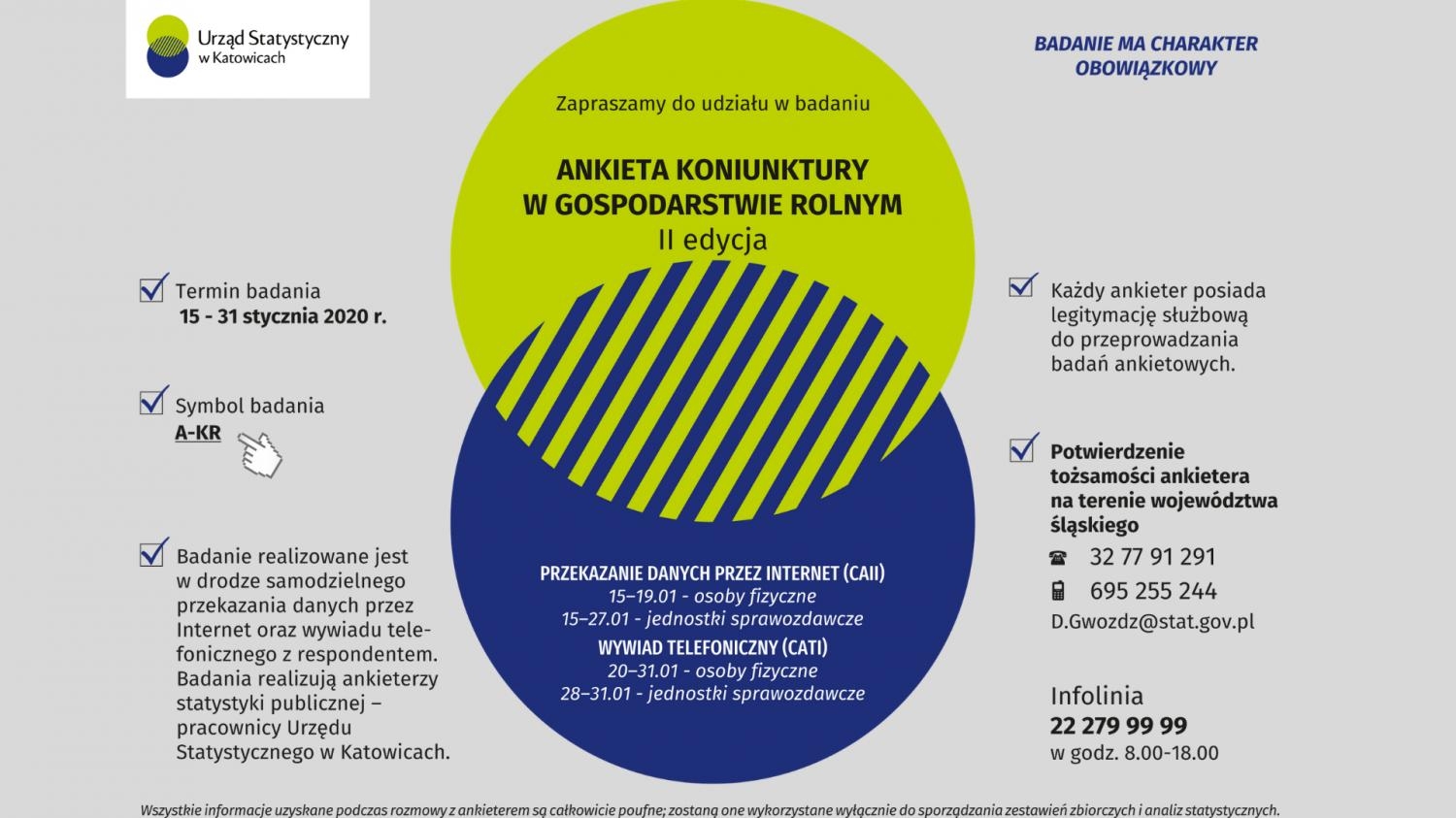 Potwierdzenie tożsamości ankietera na terenie województwa śląskiego pod numerami tel. 32 77 91 291, 695 255 244 lub mailowo: d.gwozdz@stat.gov.pl.