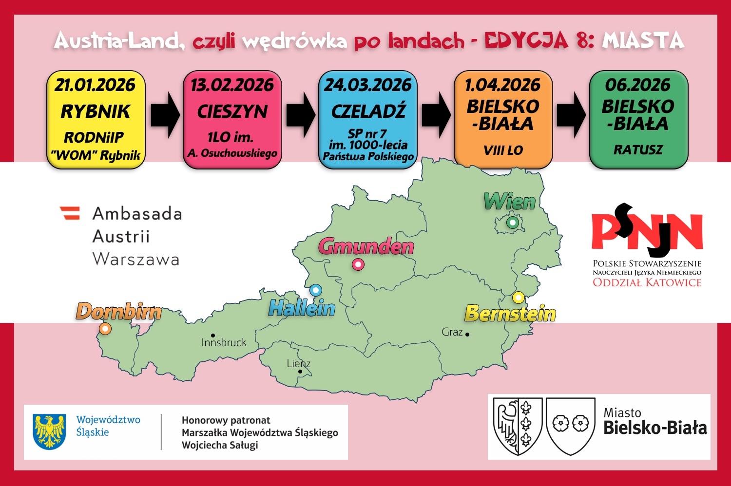 Polskie Stowarzyszenie Nauczycieli Języka Niemieckiego jest głównym pomysłodawcą konkursu, a warsztaty przeprowadziły germanistki z I Liceum Ogólnokształcącego (Anna Broda, Anna Cieślar, Anna Ochman) im. A. Osuchowskiego w Cieszynie. W tym roku przenieśliśmy się znowu do Austrii, a dokładniej do miasteczka Gmunden. Niby małe i niepozorne… a okazało się pełne historii, ciekawostek i inspirujących miejsc. Uczniowie szkół podstawowych, którzy przybyli na konkurs mogli odkrywać kulturę Austrii, a także poznać postać austriackiego pisarza Thomasa Bernharda, związanego z tym regionem. Wszystkie drużyny poradziły sobie świetnie, wykazały się dużą wiedzą, współpracą i przede wszystkim dobrą energią.