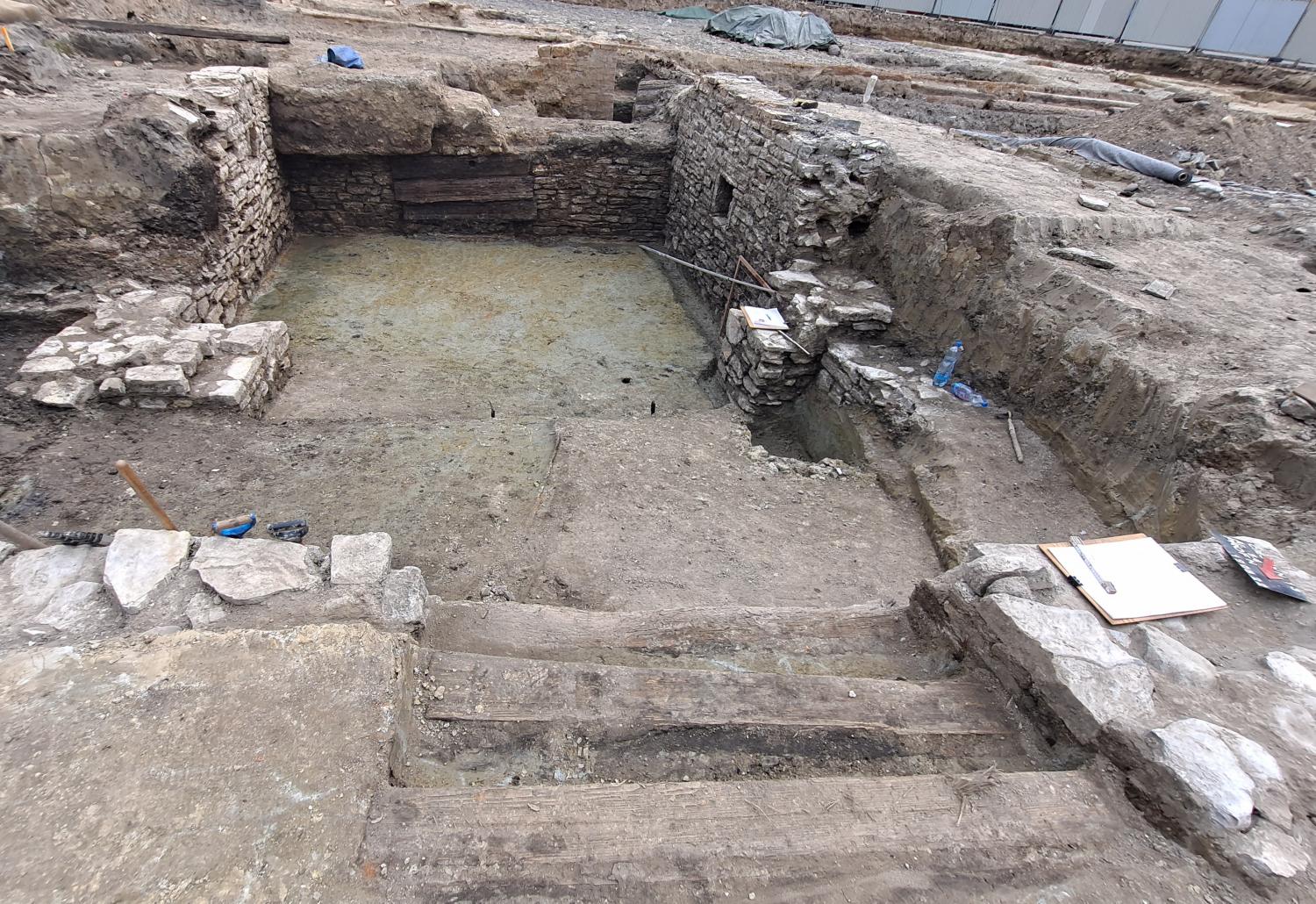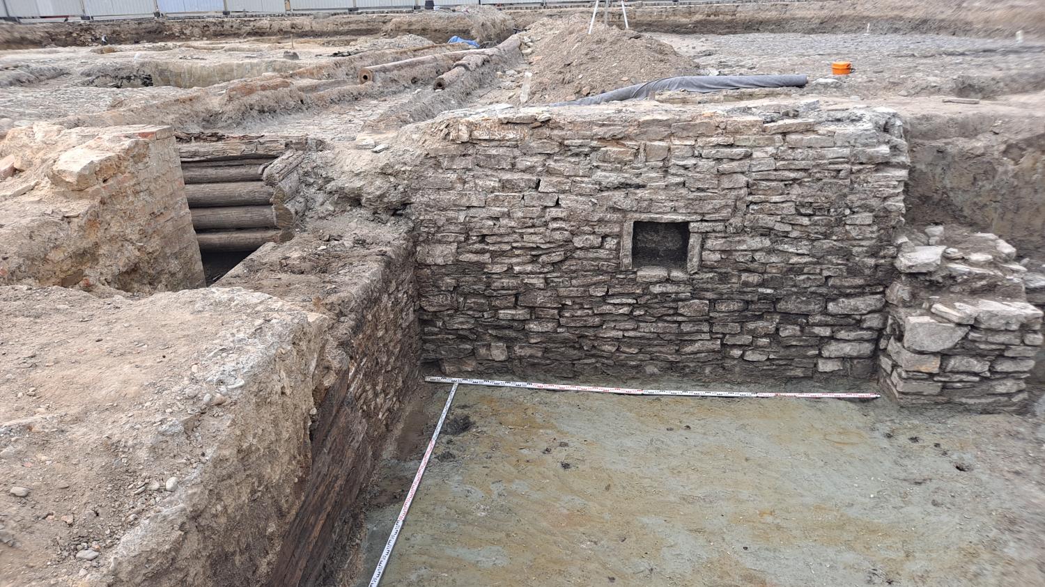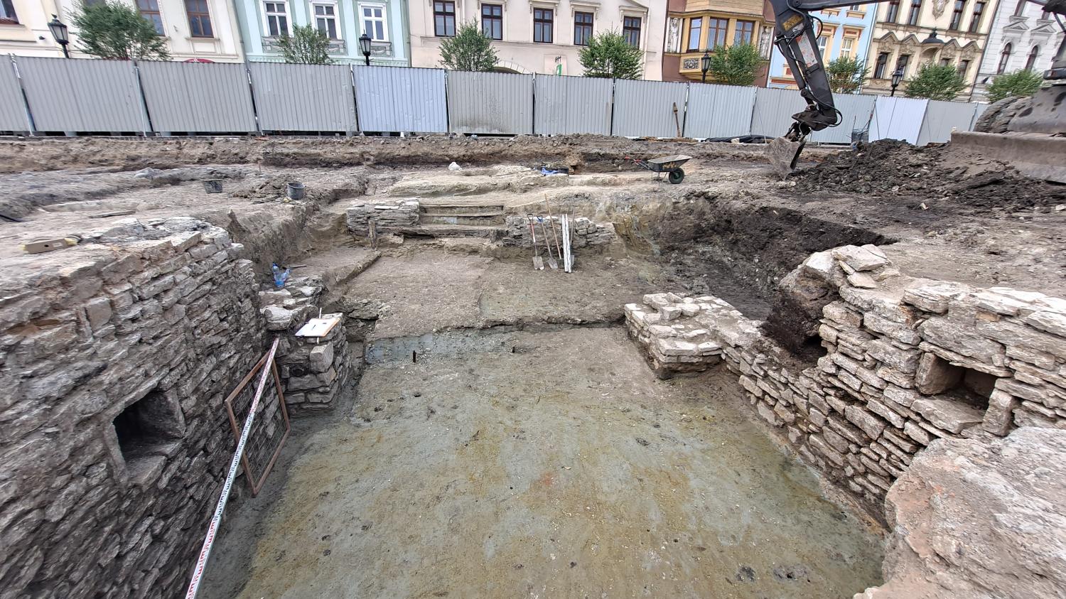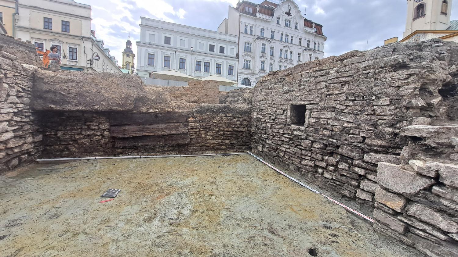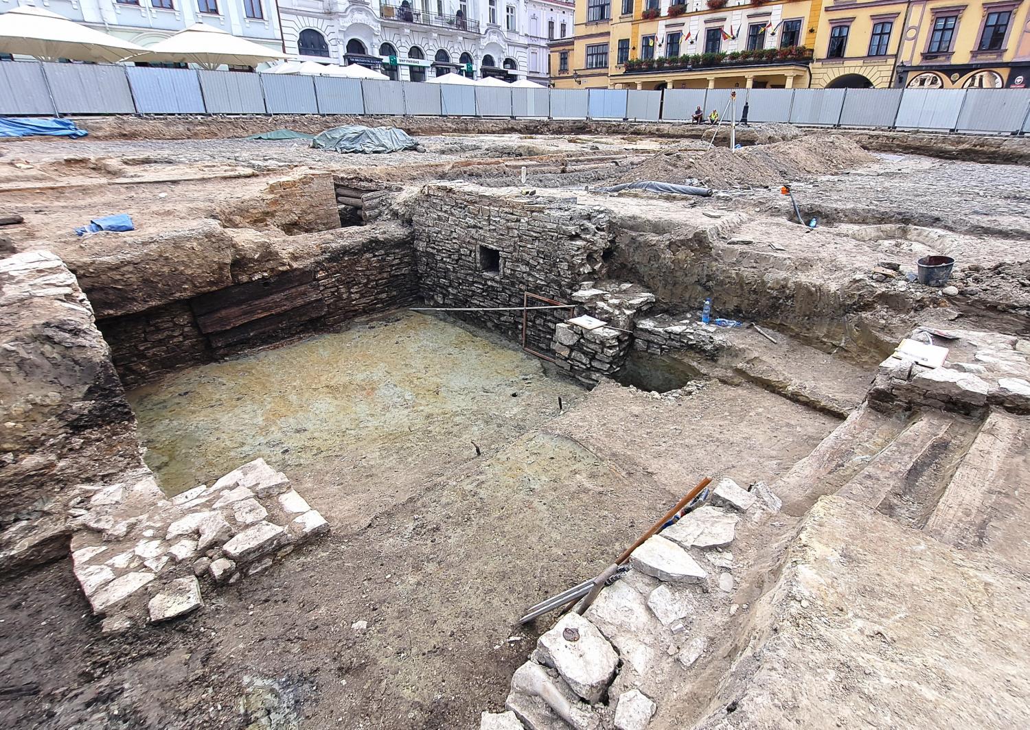 Znalezisko to nie jest widoczne na ogólnodostępnym widoku z kamery umieszczonej na ratuszowej wieży, dlatego zamieszczamy kilka jego poglądowych zdjęć. Mowa tu o piwnicy zlokalizowanej po południowo-zachodniej stronie fontanny. Jej głębokość, rozmiary i wspaniały stan zachowania zaskoczył wszystkich odkrywców! Piwnica wykonana jest z kamienia wapiennego, bardzo regularnie i starannie ułożonego. Zachowały się trzy ściany o długości ok. 5 m, do wnętrza prowadzą schody wykonane z drewnianych stopnic. W dwóch ścianach – północnej i południowej – umieszczone są ślepe okienka, które służyły jako wnęki na świece lub kaganki (aktualnie nasi pracownicy traktują je jako zacienione półeczki na wodę J). W ścianie wschodniej widoczne są trzy szerokie deski, które zasłaniają otwór drzwiowy, prowadzący do kolejnego pomieszczenia. Niestety nie możemy liczyć na kolejne tego typu znalezisko, ponieważ w miejscu drugiej piwnicy urządzono prawdopodobnie w wieku XVI cysternę na wodę. Wykonana była ona z belek drewnianych kładzionych „na zrąb”. Później w tym samym miejscu ulokowano drugą cysternę, tym razem z cegły. Tak więc pomieszczenie piwniczne, pochodzące najprawdopodobniej z wieku XV, wykorzystano w następnych stuleciach na urządzenie cystern, zaopatrujących mieszczan w wodę. Odkryta w ostatnich dniach piwniczka jest zatem częścią dużego, kilkunastometrowego budynku o fundamentach kamiennych, przy czym dwie z trzech części budynku były podpiwniczone, a trzecia piwnic nie posiadała.