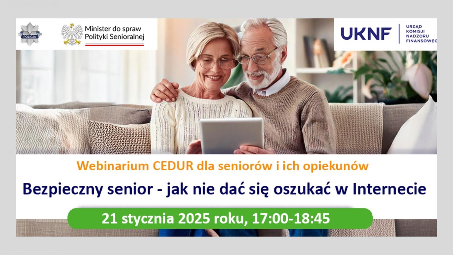 Urząd Komisji Nadzoru Finansowego zaprasza seniorów i ich opiekunów na webinarium (spotkanie online) „Bezpieczny senior – jak nie dać się oszukać w Internecie” organizowane w ramach projektu Centrum Edukacji dla Uczestników Rynku – CEDUR, we współpracy z Minister ds. Polityki Senioralnej oraz Komendą Główną Policji.