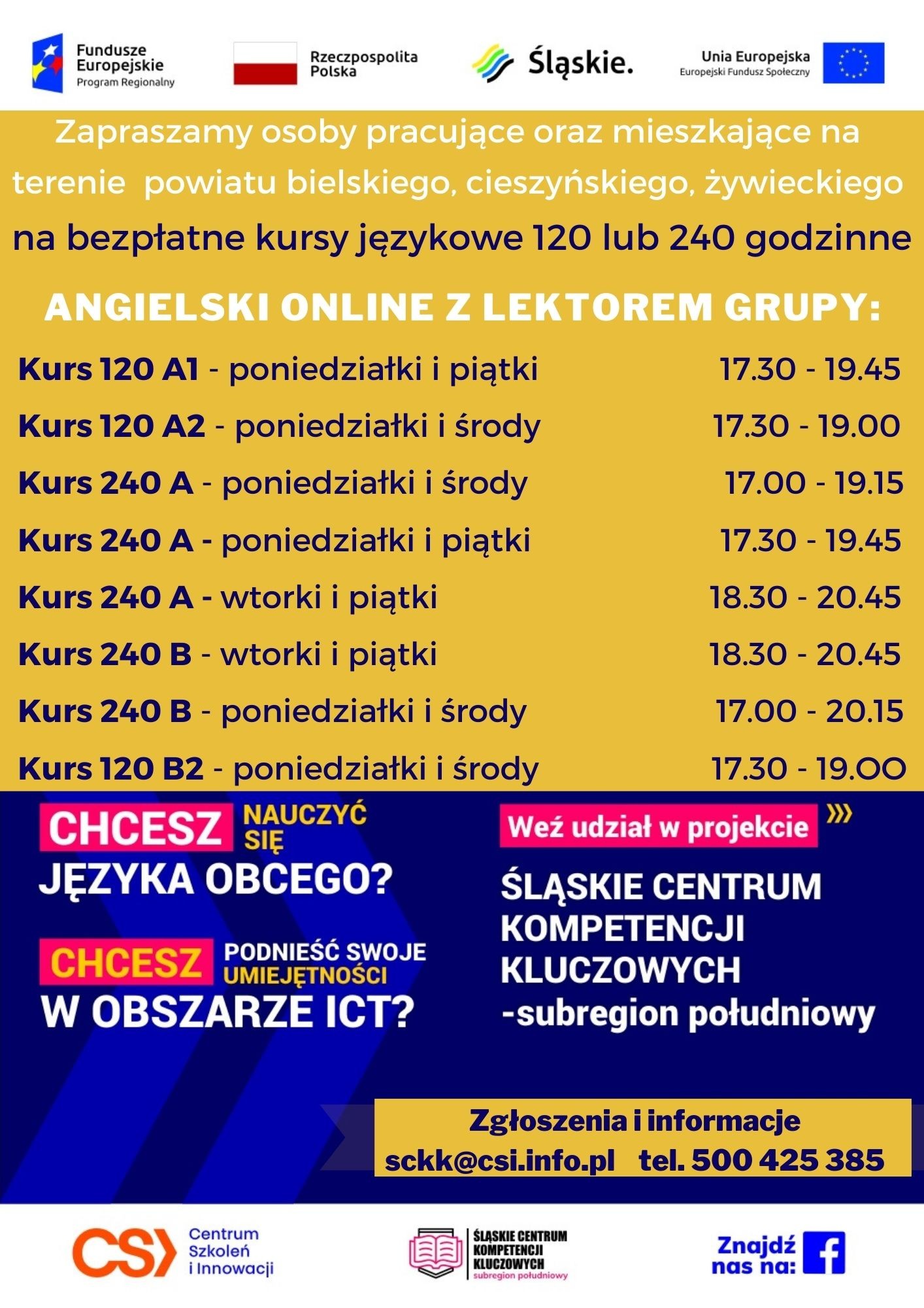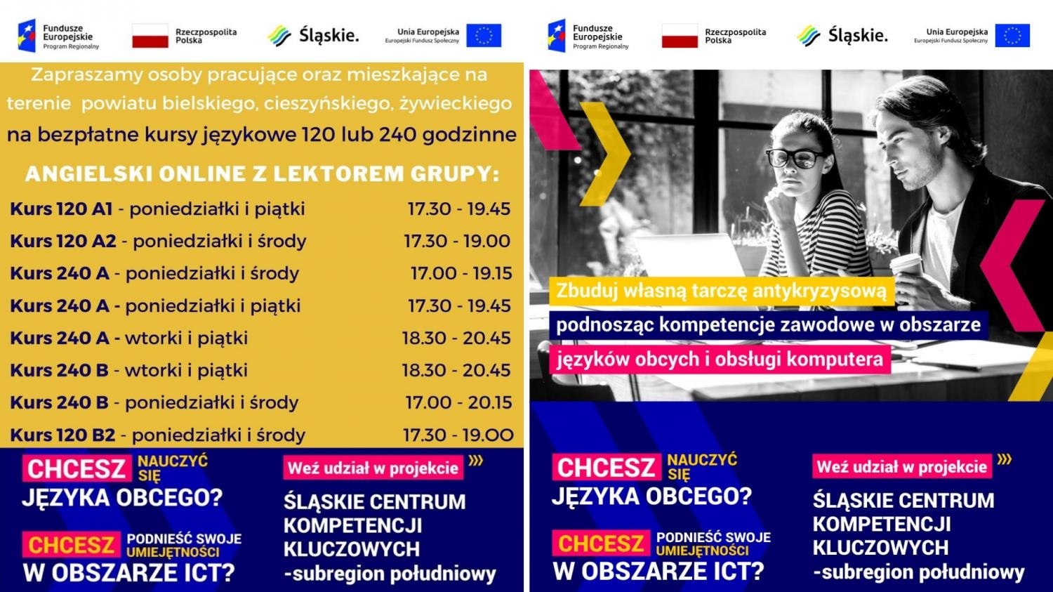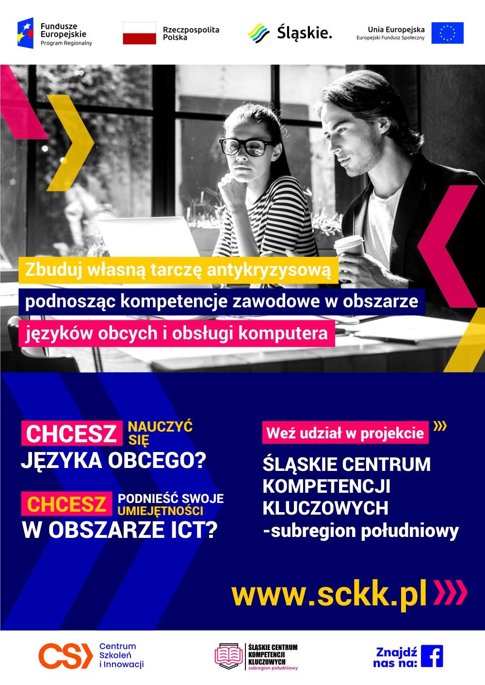 W związku prowadzonym przez Biuro Projektu „Śląskie Centrum Kompetencji Kluczowych – Subregion Południowy” wspólnie z Wojewódzkim Urzędem Pracy w Katowicach projektu nr RPSL.11.04.02-24-05AD/19 pt. Śląskie Centrum Kompetencji Kluczowych – Subregion Południowy informujemy o możliwości skorzystania z bezpłatnych szkoleń komputerowych i językowych przez pracowników i mieszańców subregionu południowego.