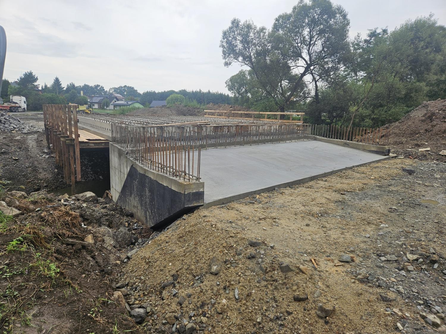 Zdjęcie przedstawia plac budowy, na którym trwa budowa nowego mostu w Kończycach Małych. W centralnej części fotografii widoczna jest konstrukcja betonowa, która stanowi podstawę nowo powstającego mostu. Betonowa płyta mostowa jest już wylana i widać zbrojenie wystające ponad jej powierzchnię, co wskazuje, że prace budowlane są w toku. Po obu stronach mostu widoczne są tymczasowe drewniane barierki zabezpieczające. W tle widoczne są drzewa oraz budynki mieszkalne, co pokazuje, że budowa odbywa się w pobliżu obszarów zamieszkałych. Na zdjęciu panuje pochmurna pogoda, co tworzy stonowaną kolorystykę obrazu.