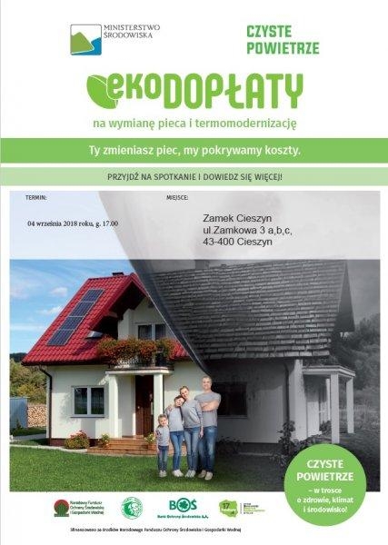 Zapraszamy na spotkanie informacyjne w ramach programu priorytetowego NFOŚiGW „Czyste powietrze”. Projekt realizowany jest we współpracy z Ministerstwem Środowiska i licznymi partnerami. Prelegentami będą eksperci z Wojewódzkiego Funduszu Ochrony Środowiska i Gospodarki Wodnej w Katowicach. Pierwsze spotkanie odbędzie 4 września br. na Zamku Cieszyn o godzinie 17.00, a drugie o tej samej porze 5 września w sali OSP w Dębowcu.