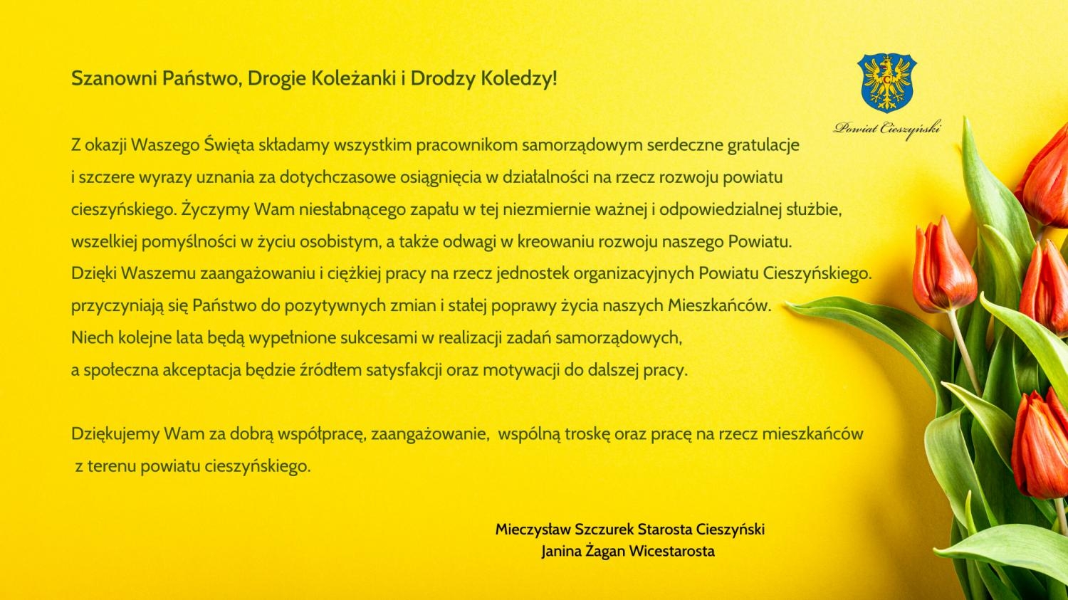 Z okazji Waszego Święta składamy wszystkim pracownikom samorządowym serdeczne gratulacje i szczere wyrazy uznania za dotychczasowe osiągnięcia w działalności na rzecz rozwoju powiatu cieszyńskiego. Życzymy Wam niesłabnącego zapału w tej niezmiernie ważnej i odpowiedzialnej służbie, wszelkiej pomyślności w życiu osobistym, a także odwagi w kreowaniu rozwoju naszego Powiatu.