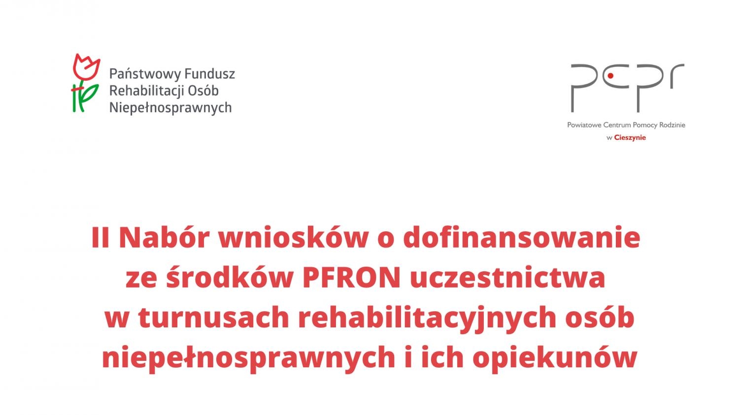 Powiatowe Centrum Pomocy Rodzinie w Cieszynie ogłasza drugi nabór wniosków o dofinansowanie ze środków Państwowego Funduszu Rehabilitacji Osób Niepełnosprawnych uczestnictwa w turnusach rehabilitacyjnych osób niepełnosprawnych i ich opiekunów.