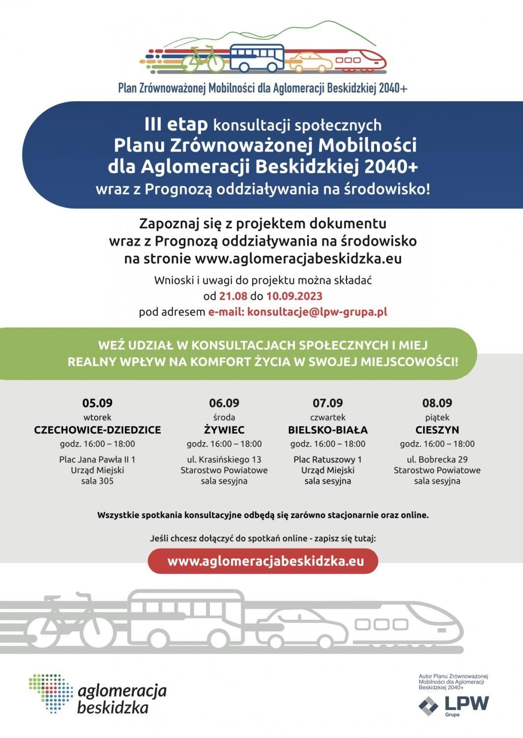 Zapraszamy na III etap konsultacji społecznych Planu Zrównoważonej Mobilności dla Aglomeracji Beskidzkiej 2040+ wraz z Prognozą oddziaływania na środowisko!