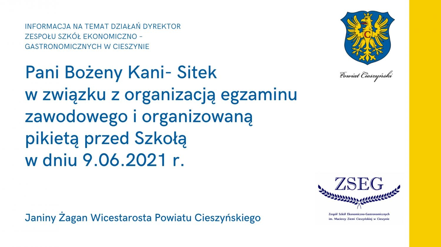 Informacja na temat działań Dyrektor Zespołu Szkół Ekonomiczno – Gastronomicznych w Cieszynie, Pani Bożeny Kani- Sitek w związku z organizacją egzaminu zawodowego i organizowaną pikietą przed szkołą w dniu 9.06.2021 r.