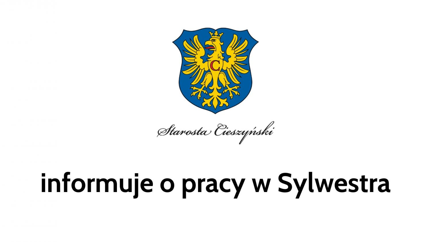 W piątek, 31 grudnia 2021 r. (Sylwester) Wydział Komunikacji Starostwa Powiatowego w Cieszynie będzie czynny do godz. 11:00, natomiast pozostałe Wydziały do godz. 12:00.