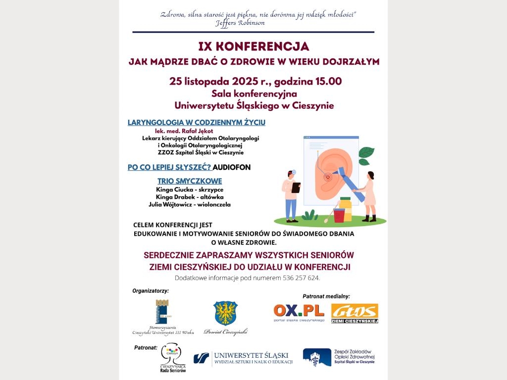 Zapraszamy na Konferencję "Jak mądrze dbać o zdrowie w wieku dojrzałym", która odbędzie się 25 listopada 2025 roku o godzinie 15.00 w sali konferencyjnej Uniwersytetu Śląskiego w Cieszynie.