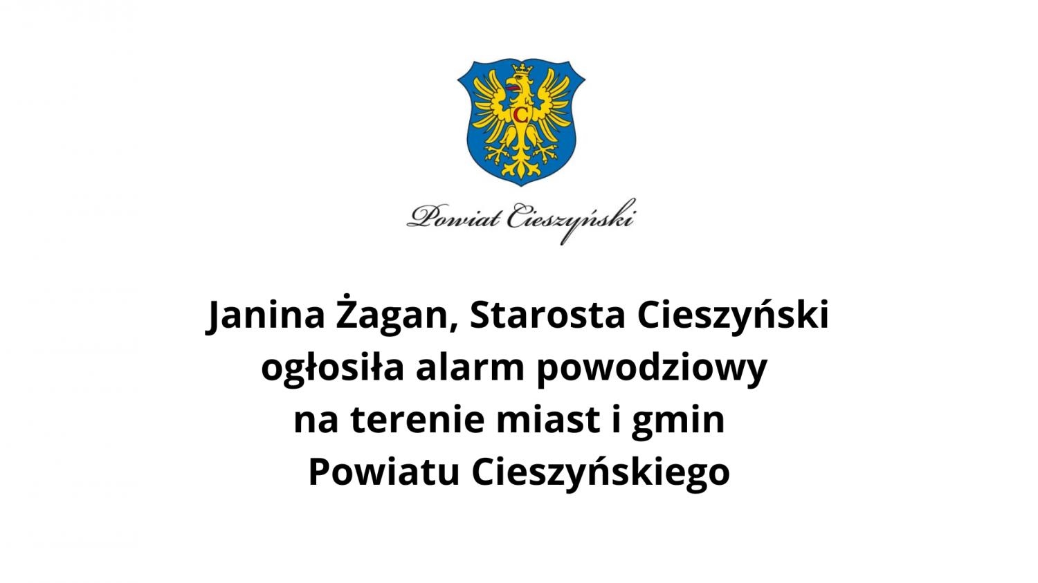 W niedzielę, 15 września 2024 r. od godz. 03:00, Janina Żagan, Starosta Cieszyński ogłosiła alarm powodziowy, który obowiązuje na terenie miast i gmin Powiatu Cieszyńskiego do odwołania.