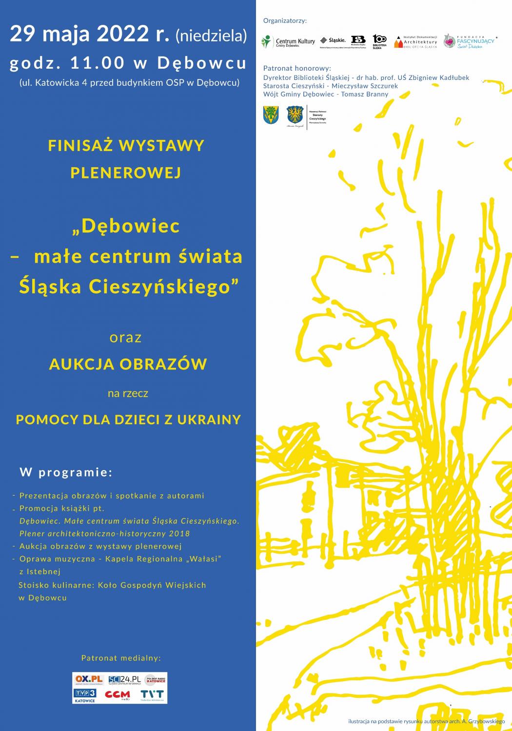 Dopełnieniem wydarzenia jest charytatywna aukcja obrazów z wystawy plenerowej, którą poprowadzi Eugeniusz Witek – aktor, kabareciarz, prezenter. Dochód w całości zostanie przeznaczony na wsparcie rodzin zastępczych z terenu powiatu cieszyńskiego opiekujących się dziećmi z Ukrainy. - To będzie licytacja z prawdziwego zdarzenia. Wszyscy uczestnicy pleneru zgodzili się przekazać swoje obrazy na licytację. Łącznie mamy 30 prac. Prezentowane są na nich perełki architektoniczne Gminy Dębowiec, pejzaże, kościoły (Kościół ewangelicki Zbawiciela w Dębowcu, Kościół katolicki pw. św. Jakuba w Simoradzu, Kościół katolicki pw. św. Małgorzaty w Dębowcu, Kościół ewangelicki Zesłania Ducha Świętego w Simoradzu), wyjątkowe miejsca, a nawet prywatne domy i gospodarstwa m.in.: stara remiza strażacka, Dwór Dębowiec, most na rzece Knajce, stary spichlerz, probostwo „Fara” w Dębowcu, stara zagroda w Dębowcu, stawy, tężnia solankowa, Radecki Dwór – wymienia Marta Szymik, dyrektor Gminnego Ośrodka Kultury -Telesz, po czym dodaje - gmina Dębowiec uwieczniona na obrazach to wyjątkowe prace, które z pewnością przypadną do gustu nie tylko mieszkańcom Gminy.