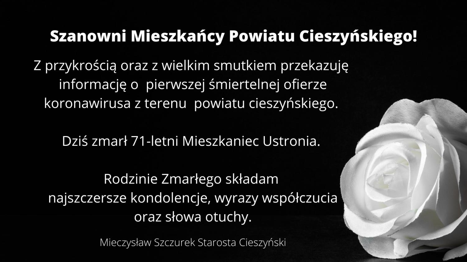 Z przykrością oraz z wielkim smutkiem przekazuję informację o śmiertelnej ofierze koronawirusa z terenu powiatu cieszyńskiego.