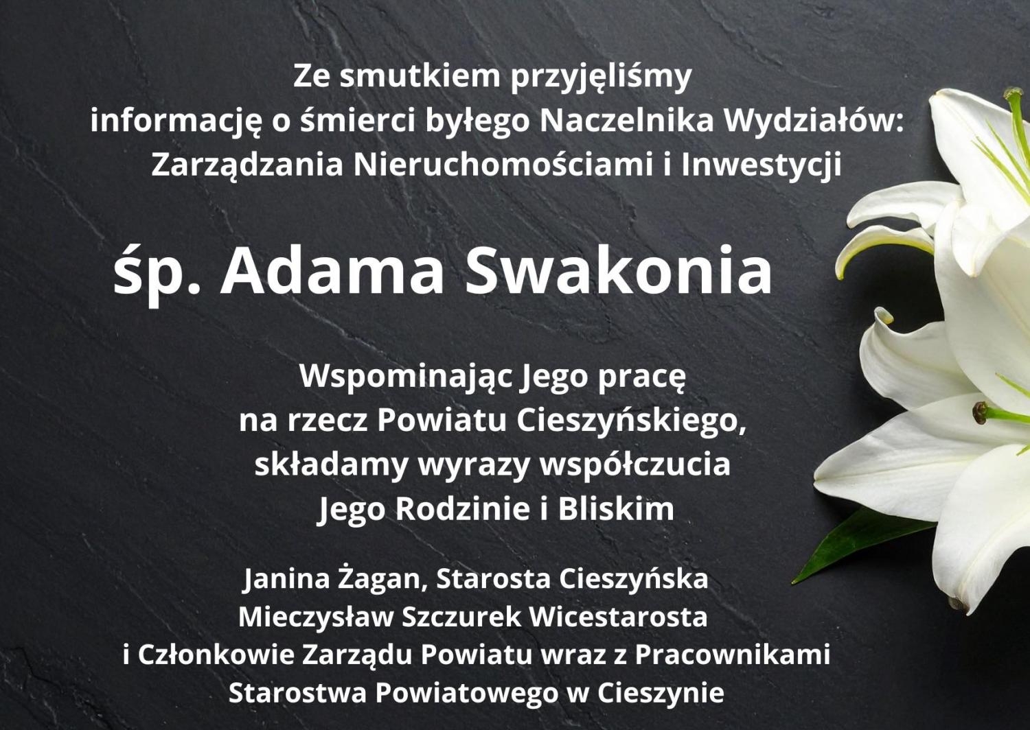 Ze smutkiem przyjęliśmy informację o śmierci byłego Naczelnika Wydziałów: Zarządzania Nieruchomościami i Inwestycji śp. Adama Swakonia.