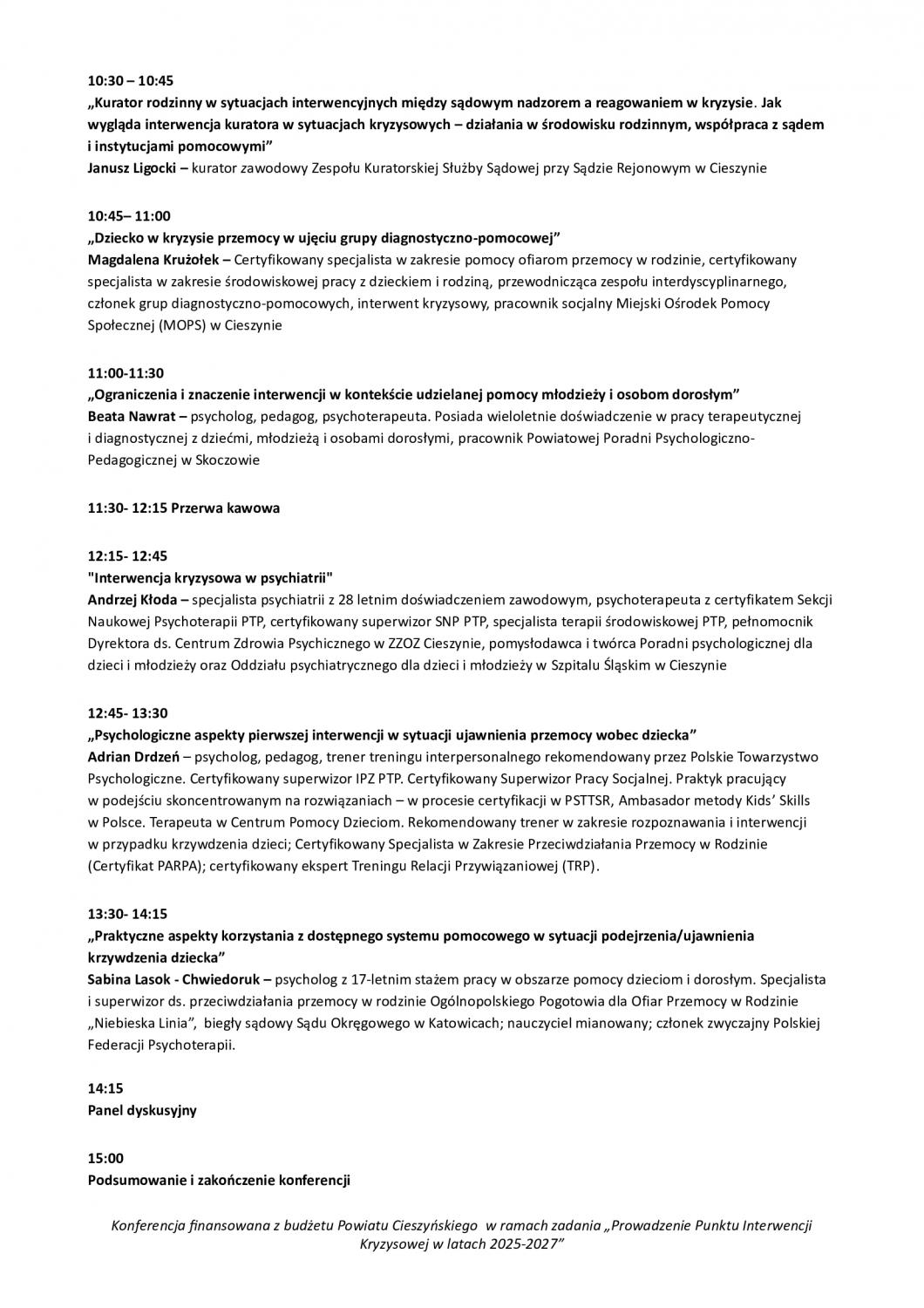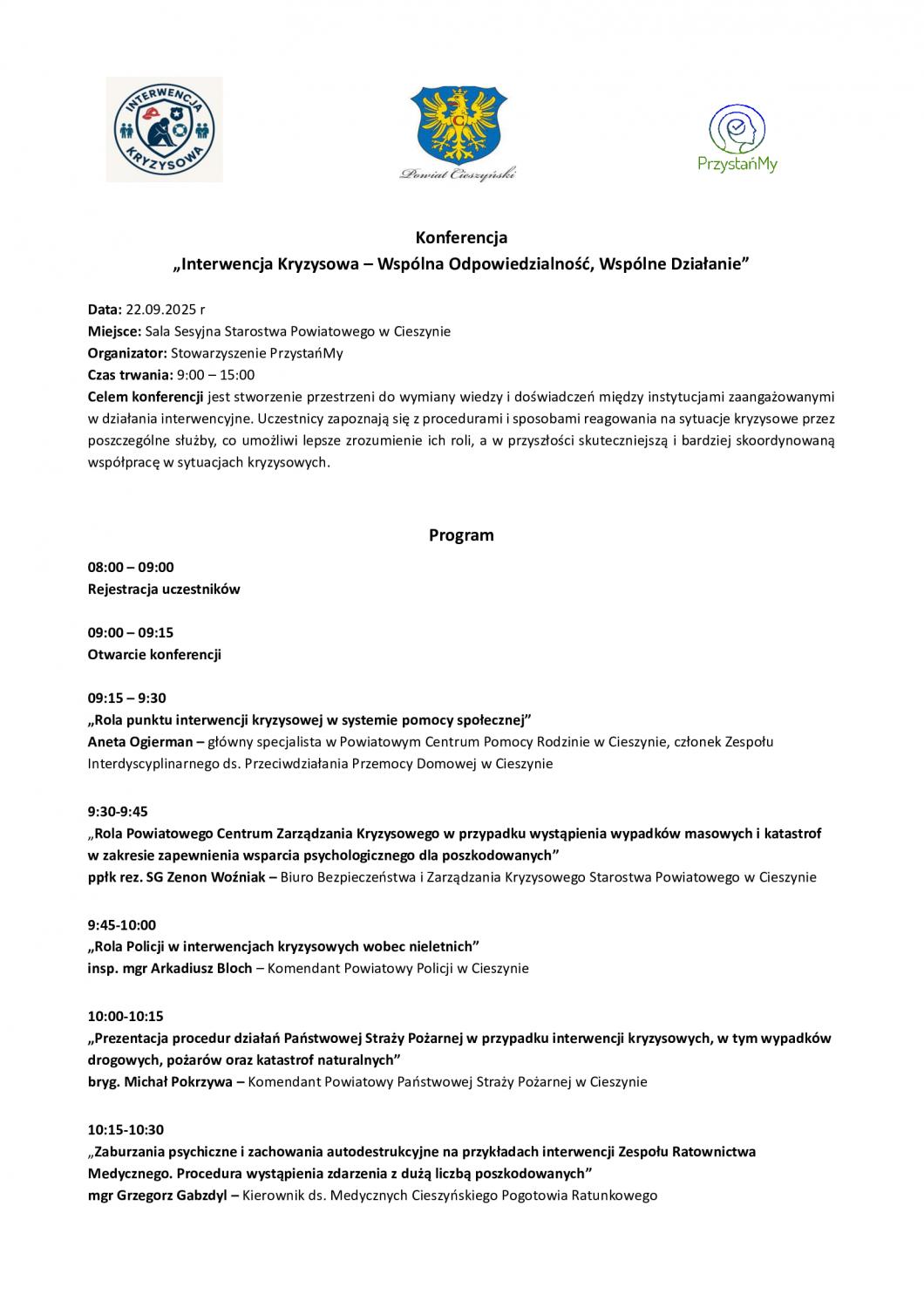 Stowarzyszenie PrzystańMy serdecznie zaprasza na konferencję pt. „Interwencja kryzysowa, wspólna odpowiedzialność, wspólne działanie”, która odbędzie się 22 września 2025 roku w godz. 8.00–15.00 w sali sesyjnej Starostwa Powiatowego w Cieszynie.