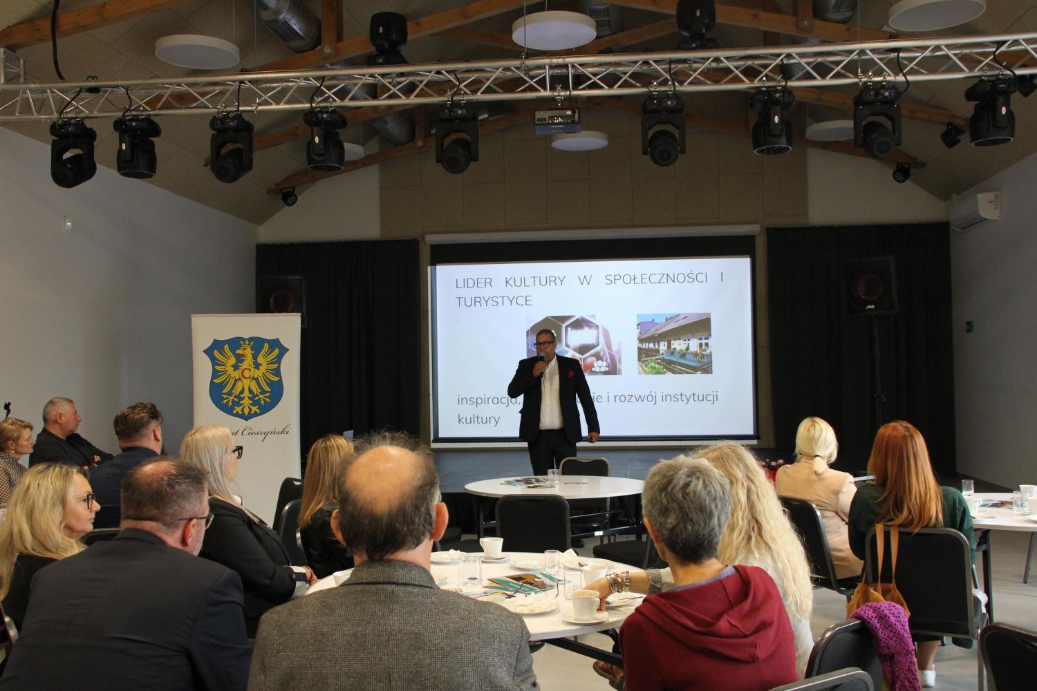 Zgromadzeni mieli także okazję wysłuchać inspirującej prelekcji pt. „Lider kultury w społeczności i turystyce – inspiracja, zarządzanie i rozwój instytucji kultury”, którą wygłosił Mariusz Mrożek - trener Lean Management, konsultant biznesu i menedżer z 20 letnim stażem.