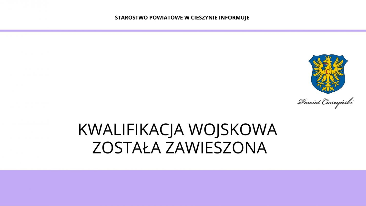 Na podstawie pisma Śląskiego Urzędu Wojewódzkiego w Katowicach znak: SOVIII.6610.10.2020 z dnia 13 marca 2020 r., w związku z zagrożeniem koronawirusem informujemy, iż kwalifikacja wojskowa na terenie całego kraju została zawieszona od 16 marca 2020 r.