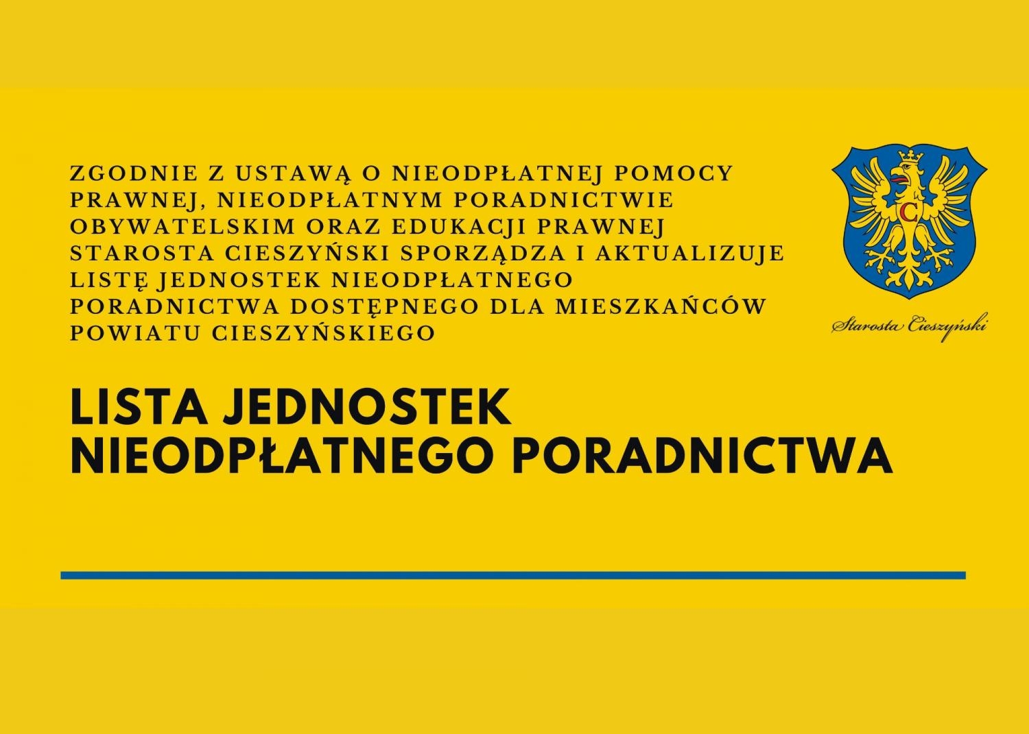 Zgodnie z ustawą o nieodpłatnej pomocy prawnej, nieodpłatnym poradnictwie obywatelskim oraz edukacji prawnej Starosta Cieszyński zaktualizował listę jednostek nieodpłatnego poradnictwa dostępnego dla mieszkańców Powiatu Cieszyńskiego.