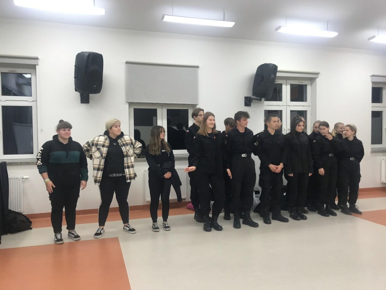 Nocna impreza rozpoczęła się pokazem musztry zespołowej na przyszkolnym boisku. Drużynowi czterech klas zameldowali dyrektorowi szkoły gotowość do rozpoczęcia udziału w manewrach ratowniczo – pożarniczych.
