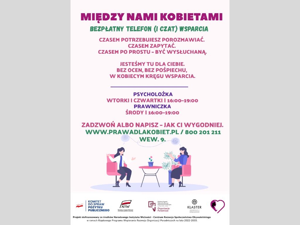 Czasem potrzebujesz porozmawiać. Czasem zapytać. Czasem po prostu – być wysłuchaną. Właśnie z takiego założenia powstała inicjatywa „Między nami kobietami” – bezpłatny telefon (i czat) wsparcia, skierowany do kobiet, które potrzebują rozmowy, porady lub obecności drugiej osoby.