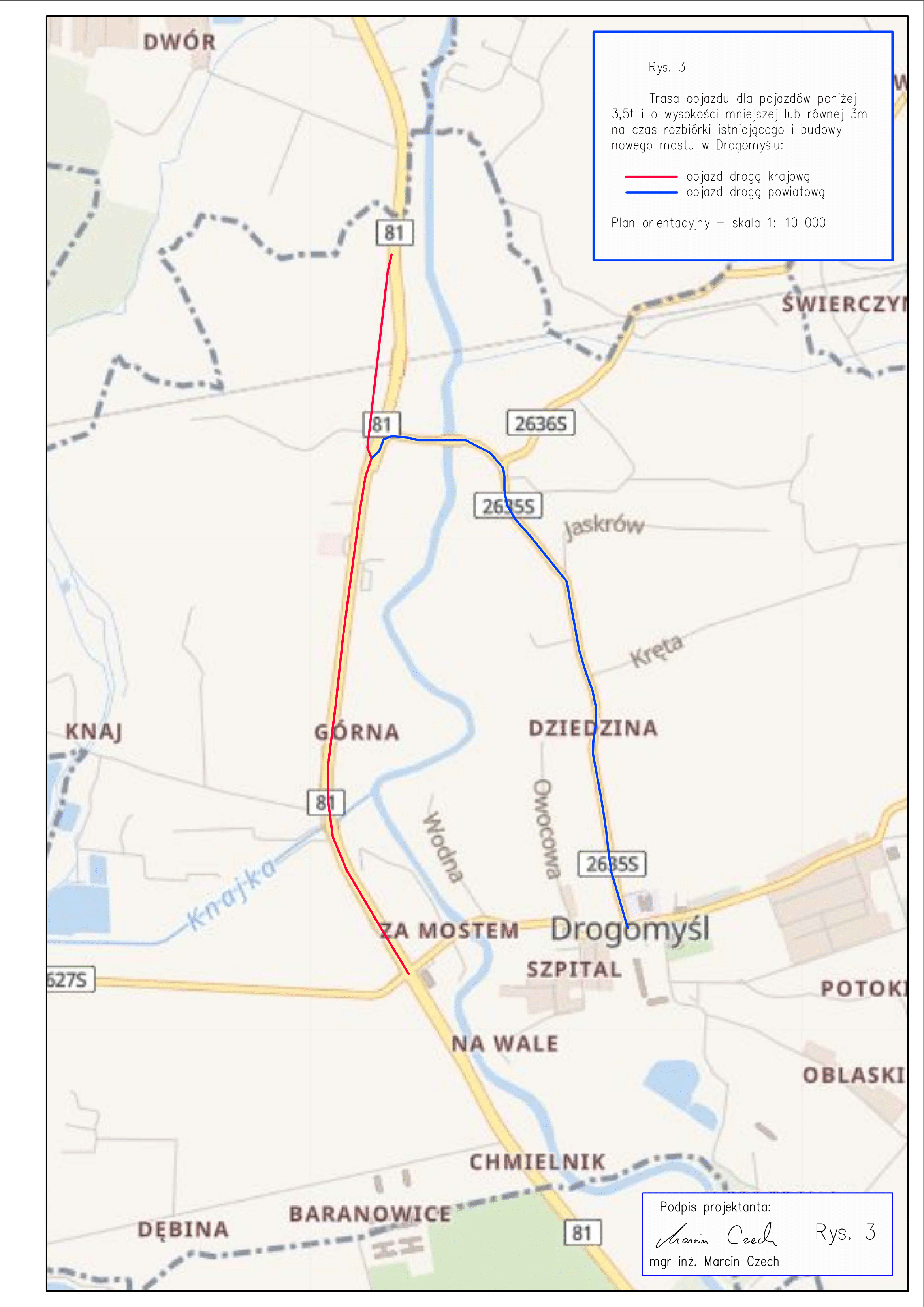 Objazd dla pojazdów o dopuszczalnej masie całkowitej do 3,5 t lub wysokości do 3,0 m zostanie przeprowadzony drogą krajową DK-81 oraz drogami powiatowymi ul. Wiejską i ul. Wiślańską w Drogomyślu.
