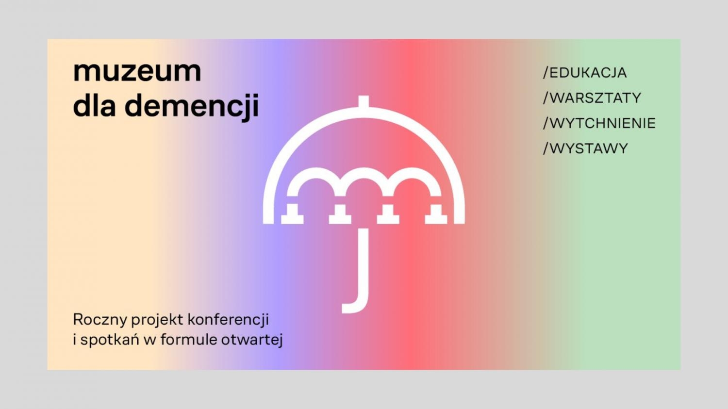 Grafika promująca projekt „Muzeum dla Demencji”. Po lewej stronie na beżowo-fioletowym tle widnieje nazwa projektu, a pod nią napis: „Roczny projekt konferencji i spotkań w formule otwartej”. Po prawej, na tle gradientowym, widnieje biały parasol oraz słowa: „Edukacja, Warsztaty, Wytchnienie, Wystawy”.