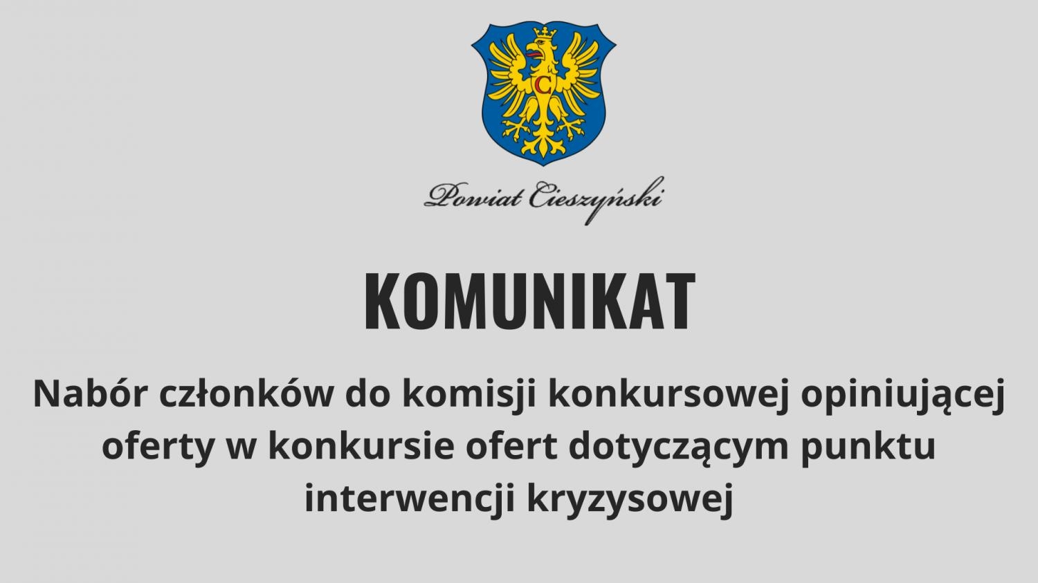 W związku z ogłoszeniem przez Zarząd Powiatu Cieszyńskiego otwartego konkursu ofert na powierzenie realizacji zadania publicznego, z zakresu pomocy społecznej, polegającego na: prowadzeniu punktu interwencji kryzysowej w latach 2025-2027, zapraszamy organizacje pozarządowe i podmioty wymienione w art. 3 ust. 3 ustawy z dnia 24 kwietnia 2003 r. o działalności pożytku publicznego i o wolontariacie (tekst jednolity: Dz. U. 2024 r., poz. 1491) do udziału w pracach Komisji Konkursowej Opiniującej Oferty (zwanych dalej komisją/komisjami) złożone w ww. otwartym konkursie ofert.