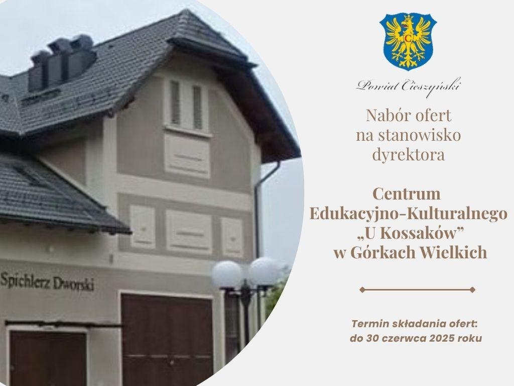 Zarząd Powiatu Cieszyńskiego informuje, że przeprowadza postępowanie kwalifikacyjne, w ramach którego zaprasza do składania ofert osoby zainteresowane objęciem funkcji dyrektora instytucji kultury pn. Centrum Edukacyjno-Kulturalne „U Kossaków” w Górkach Wielkich.