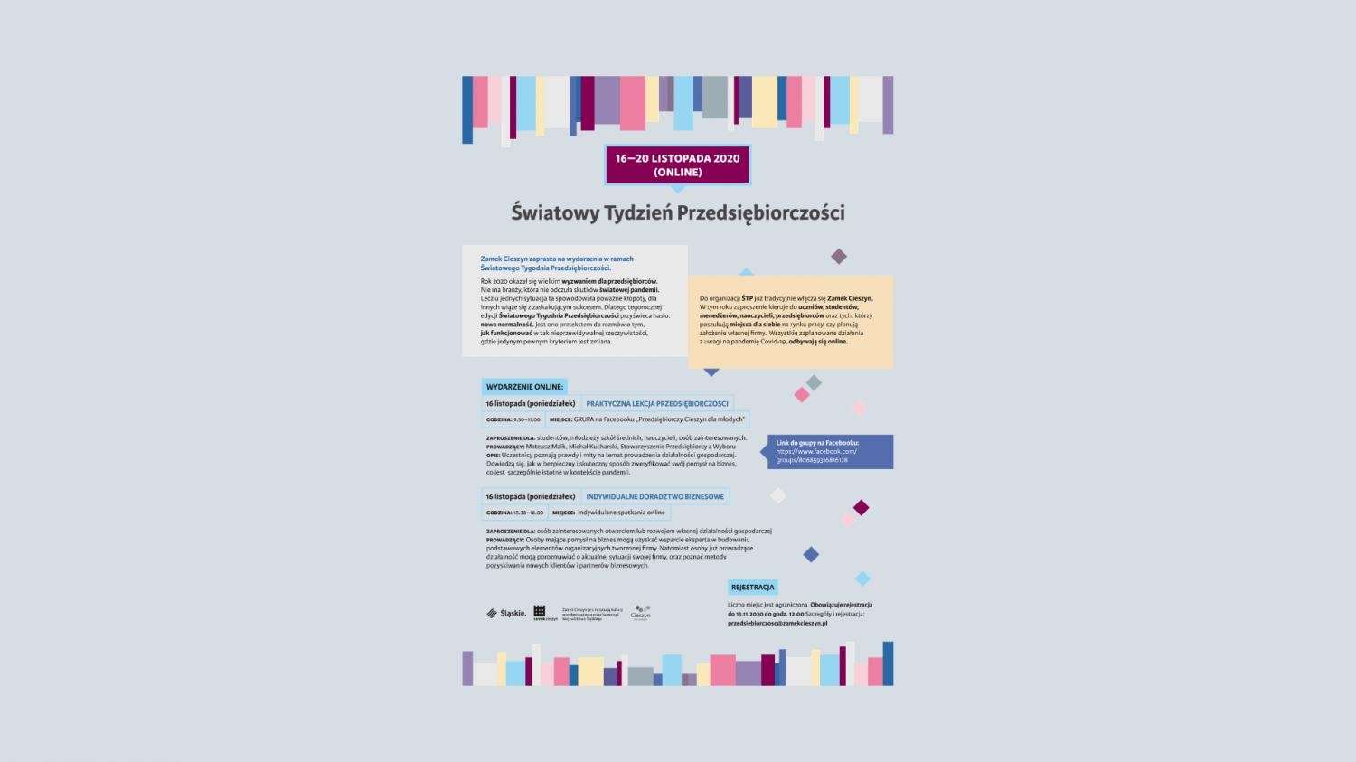 Liczba miejsc jest ograniczona. Obowiązuje rejestracja mailowa do 13.11.2020 do godz. 12.00. Szczegóły i rejestracja: przedsiebiorczosc@zamekcieszyn.pl