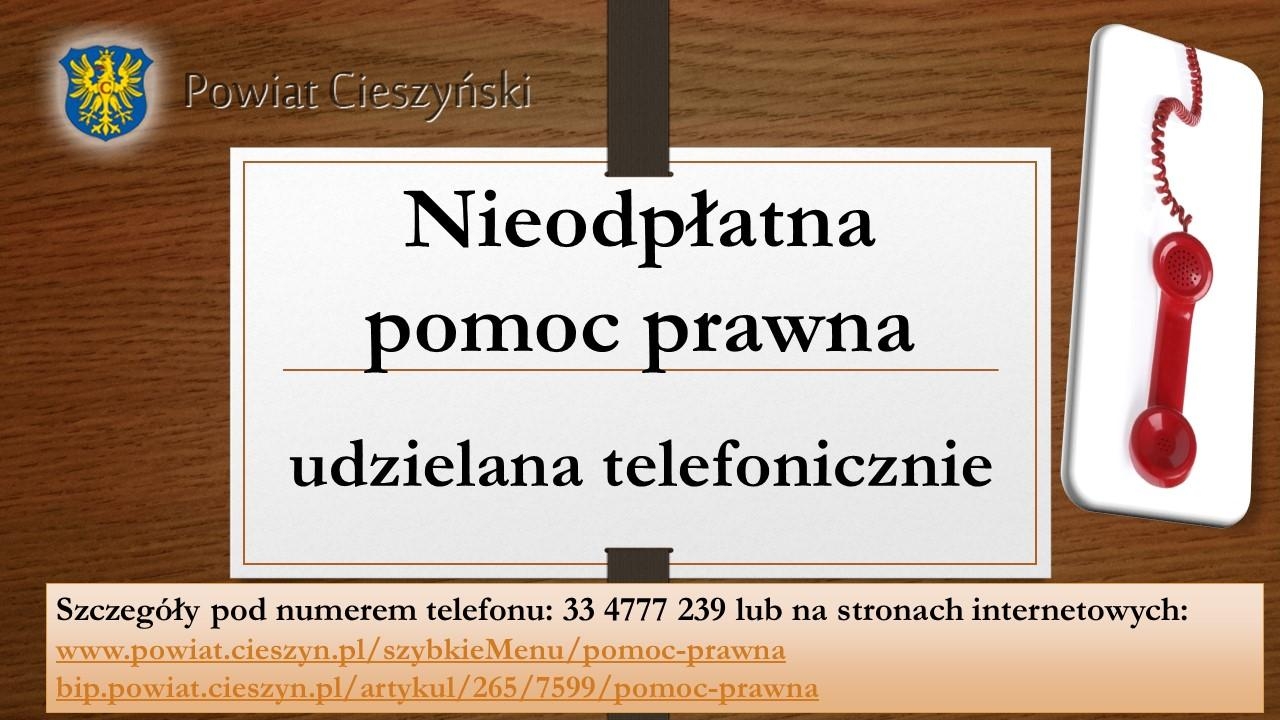 Szczegóły pod numerem telefonu 33 4777 239 lub na stronach internetowych: www.powiat.cieszyn.pl/szybkieMenu/pomoc-prawna bip.powiat.cieszyn.pl/artykul/265/7599/pomoc-prawna