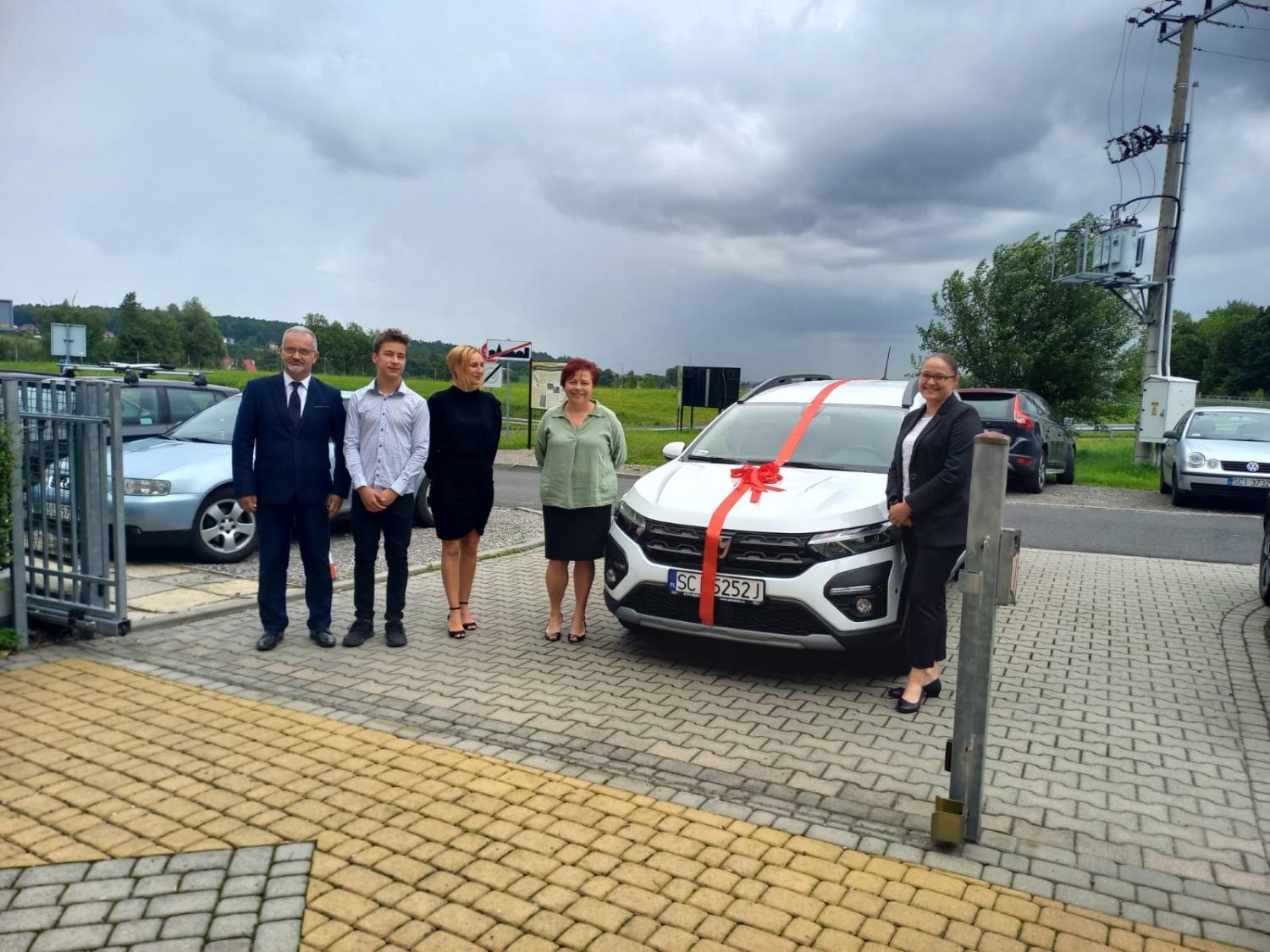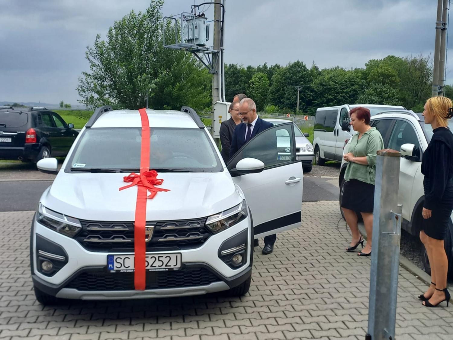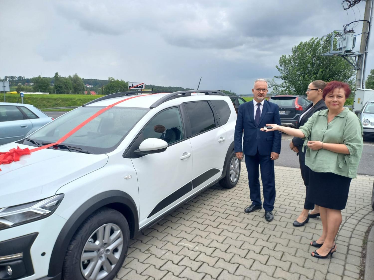 W poniedziałek, 11.07.2022 r. Mieczysław Szczurek Starosta Cieszyński uroczyście przekazał na ręce Małgorzaty Ratajczak, Dyrektor Domu Dziecka w Międzyświeciu kluczyki do nowego samochodu służbowego - Dacii Jogger.