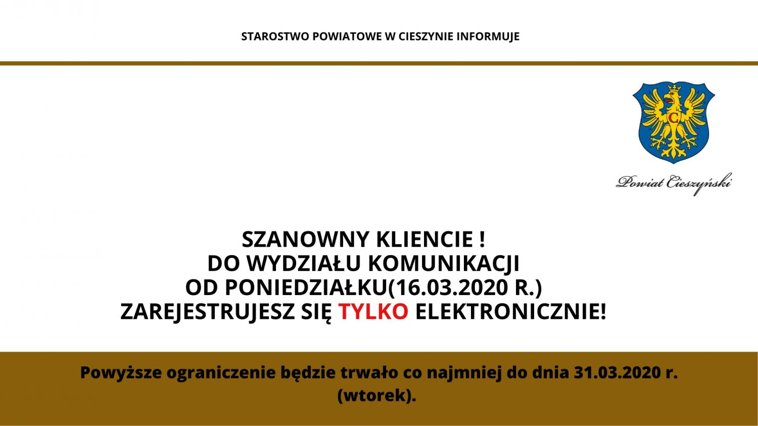 Od poniedziałku (16.03.2020 r.) w Wydziale Komunikacji Starostwa Powiatowego w Cieszynie obowiązuje WYŁĄCZNIE rezerwacja elektroniczna!