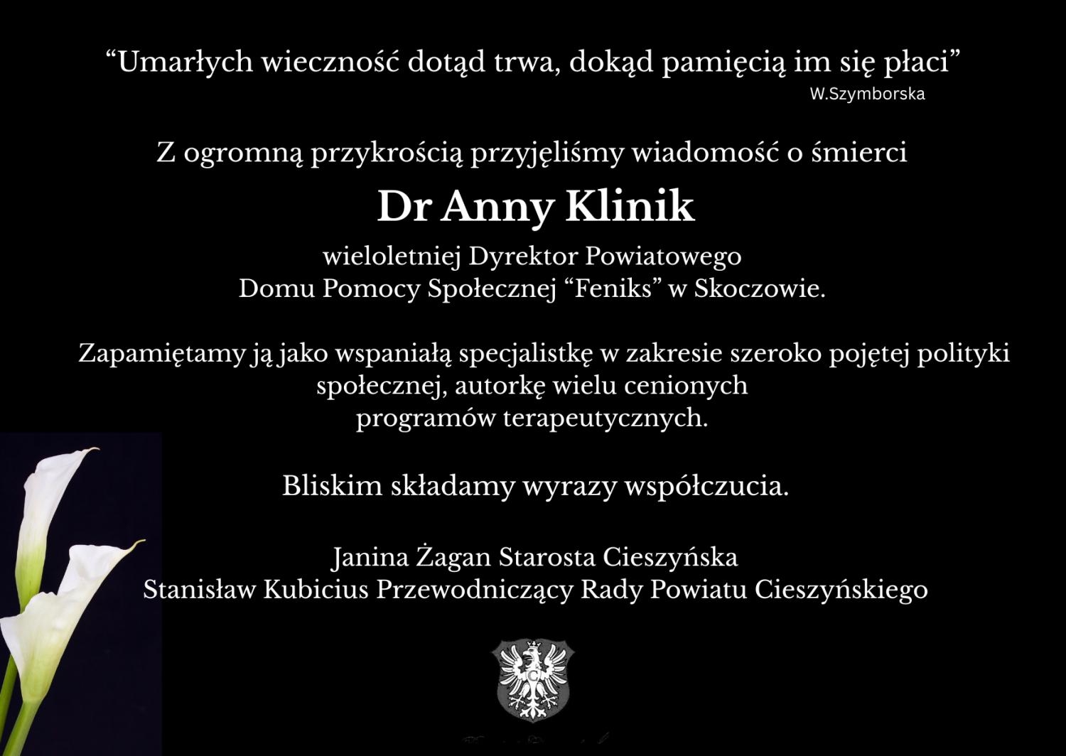 Z ogromną przykrością przyjęliśmy wiadomość o śmierci śp. Dr Anny Klinik, wieloletniej Dyrektor Powiatowego Domu Pomocy Społecznej "Feniks" w Skoczowie. Zapamiętamy ją jako specjalistkę szeroko pojętej polityki społecznej.