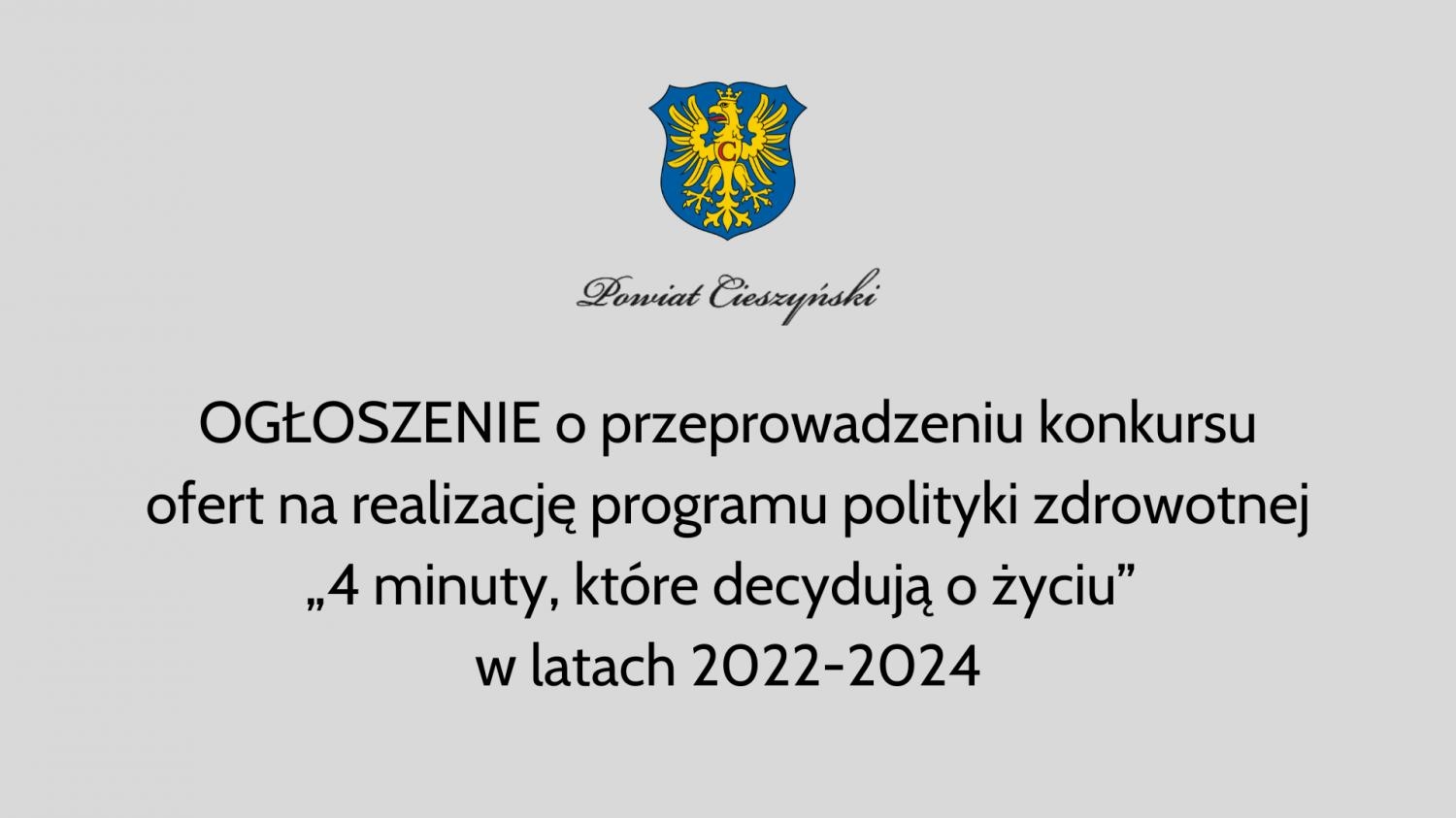 Zarząd Powiatu Cieszyńskiego z siedzibą w Cieszynie przy ul. Bobreckiej 29, działając na podstawie: art. 4 ust. 1 pkt 2 ustawy z dnia 5 czerwca 1998 r. o samorządzie powiatowym (tekst jednolity: Dz. U. z 2022 r. poz. 1526.), art. 48b ust. 1 ustawy z dnia 27 sierpnia 2004 r. o świadczeniach opieki zdrowotnej finansowanych ze środków publicznych (tekst jednolity: Dz. U. z 2021 r. poz. 1285 z późn. zm.) i art. 13 pkt 3 i art. 14 ustawy z dnia 11 września 2015 r. o zdrowiu publicznym (tekst jednolity: Dz. U. z 2021 r. poz. 1956 z późn. zm.) ogłasza konkurs ofert na realizatora programu polityki zdrowotnej „4 minuty, które decydują o życiu” w latach 2022-2024.