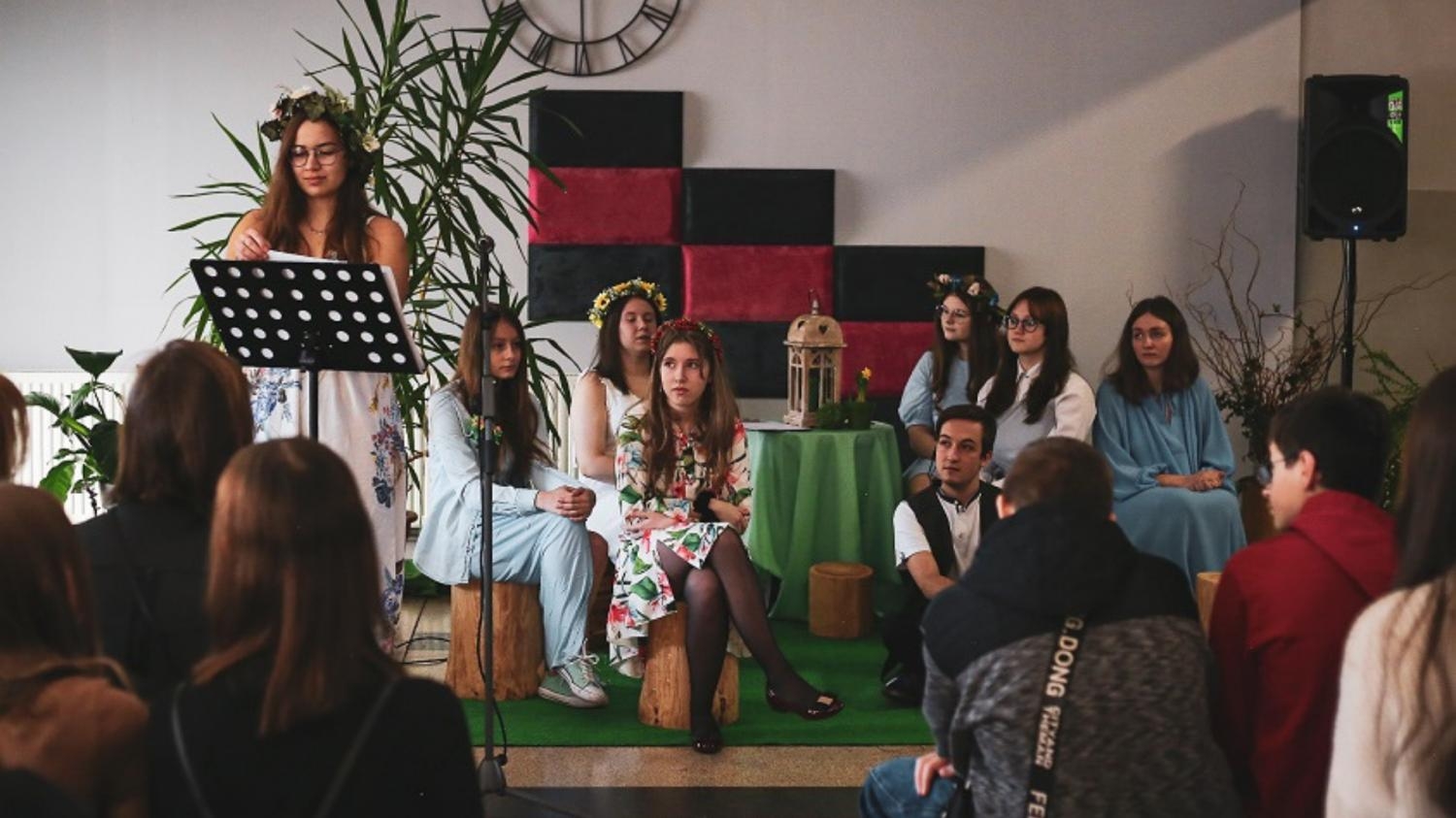 Zieloną przygodę zaproszeni goście rozpoczęli od wysłuchania koncertu w holu szkoły, który dzięki p. Dorocie Szewczyk zamienił się na tę okazję w ukwieconą łąkę. Koncert wg pomysłu p. Pauliny Damek-Ryszki był poświęcony twórczości poetki i autorki tekstów Agnieszce Osieckiej. Nasi utalentowani uczniowie przy akompaniamencie p.Błażeja Knopka wykonali takie utwory jak: „Ludzkie gadanie” (Julia Nogowczyk), „Dziś prawdziwych Cyganów już nie ma” (Emilia Czepiec), „Miasteczko cud” (Estera Tomaszko), „Małgośka” (Marzena Chmura), „Żyj mój świecie” (Agnieszka Gomola), „Niech no tylko zakwitną jabłonie” (Marta Pieczyrak) oraz „Zielono mi” (Liliana Majsterkiewicz). Pomiędzy piosenkami wybrzmiał wiersz „ Zielono mi” recytowany przez Cypriana Przybyłę.