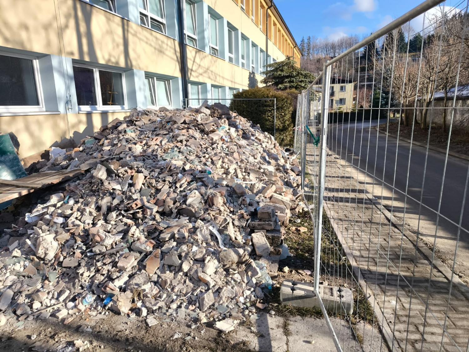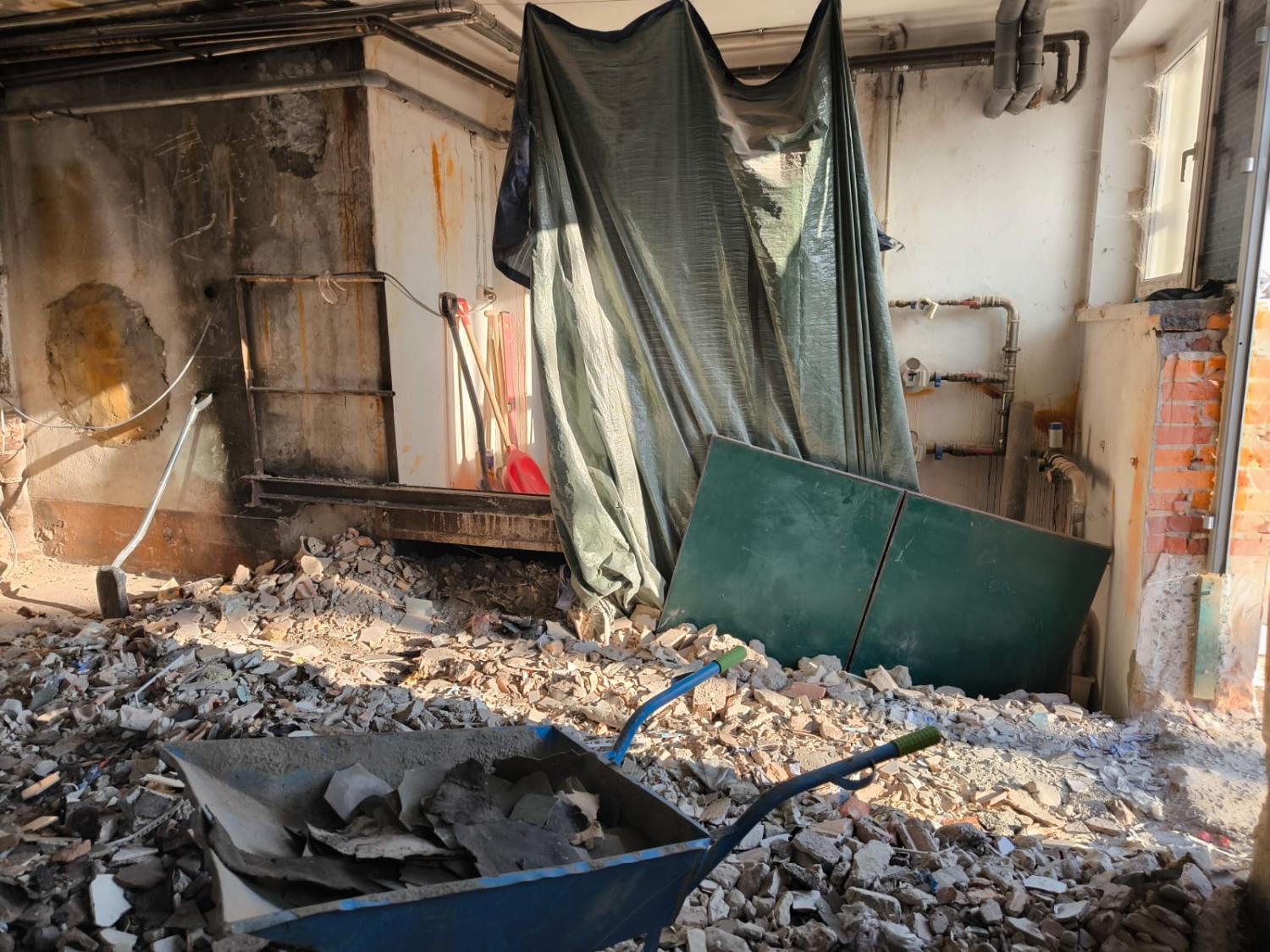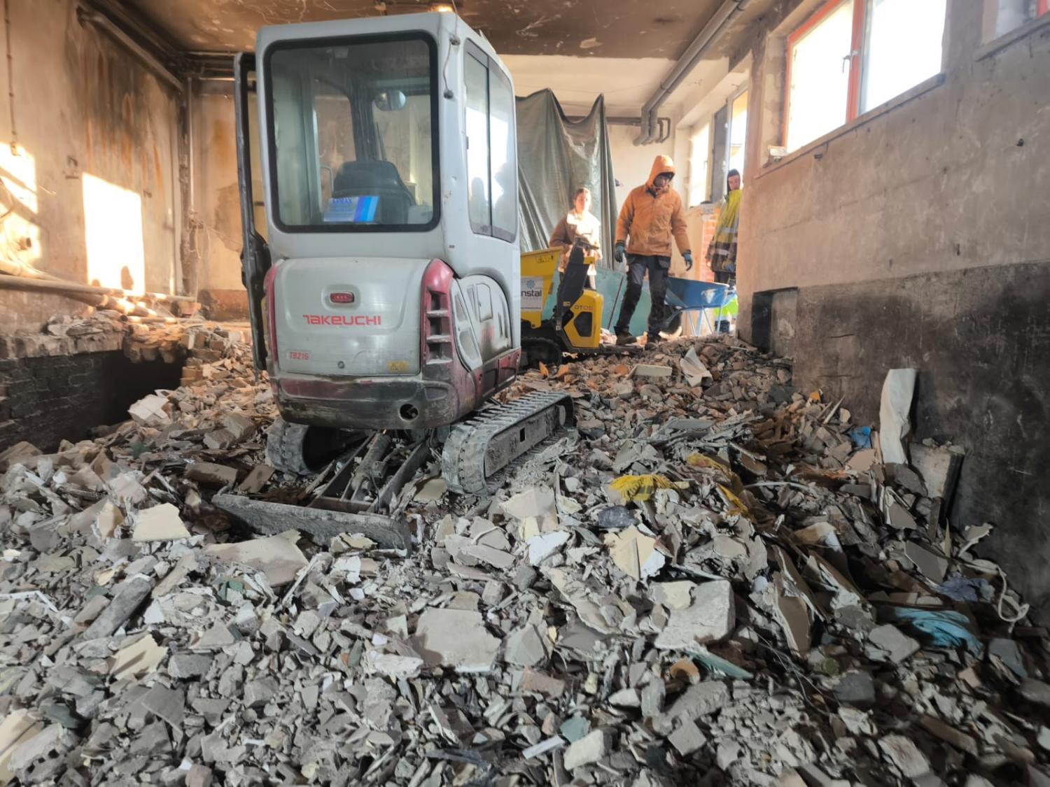 Aktualnie prowadzone są prace przygotowawcze: rozbiórkowe m.in. demontaż istniejących stalowych schodów wewnętrznych, wykucie fragmentu wewnętrznej ściany konstrukcyjnej, odgruzowanie pomieszczenia, sprawdzenie i odgruzowanie przewodów kominowych, zabezpieczenie (wcześniej wymienionej, nowej) stolarki okiennej osłoną z foli, wywiezienie gruzu, zasypanie rumoszem skalnym pomieszczenia po odgruzowaniu, zagęszczenie i ubicie nowych warstw.