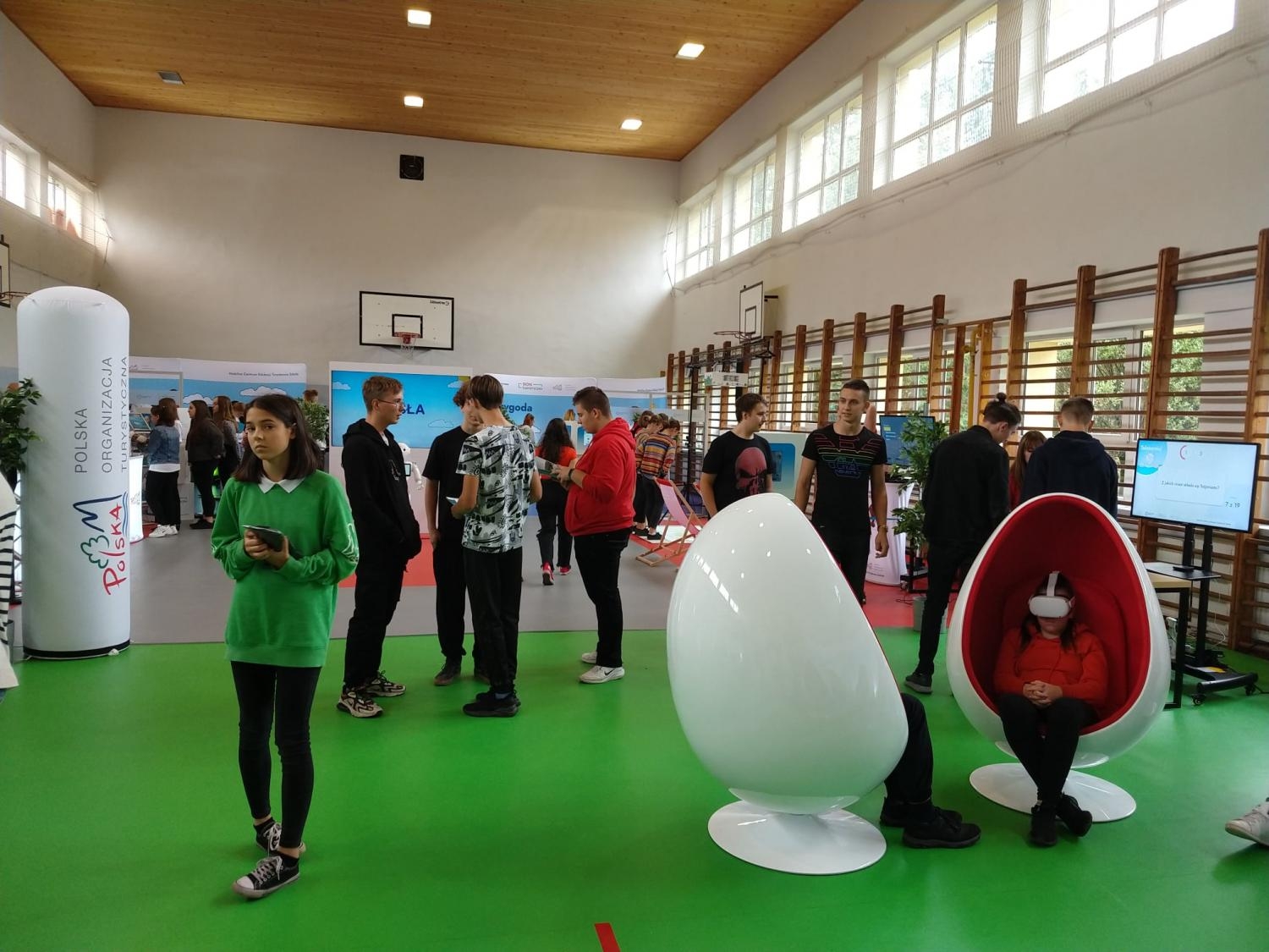 Warsztaty turystyczne skierowane do dzieci i młodzieży okolicznych szkół urozmaiciły tradycyjne lekcje. Zajęcia prowadzone były z wykorzystaniem wysokiej klasy sprzętu do gier i symulacji komputerowej, które przybliżyły specyfikę, atrakcje oraz potencjał turystyczny najatrakcyjniejszych regionów w Polsce. Uczniowie mieli możliwość sprawdzenia swojej wiedzy w quizach o tematyce geograficznej, turystycznej czy sportowej. Korzystając z rozszerzonej rzeczywistości (okulary VR), udaliśmy się w cyfrową podróż po Polsce, startowaliśmy w wirtualnym wyścigu kolarskim oraz rywalizowaliśmy w różnych dyscyplinach sportowych. Uczestników witał Pepper – sympatyczny humanoidalny robot, który zachęcał do wspólnej zabawy, tańczył i grał z odwiedzającymi.