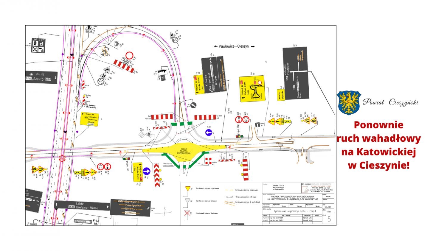 W związku z trwającą realizacją zadania obejmującą przebudowę skrzyżowania ul. Katowickiej z łącznicą S 52 w Cieszynie Wykonawca robót Firma Eurovia Polska S.A. Oddział w Bielsku-Białej informuje mieszkańców oraz użytkowników ul. Katowickiej, że z przyczyn technologicznych oraz dla zapewnienia bezpieczeństwa ruchu drogowego, na czas wykonywania robót związanych z budową ronda od dnia 10 stycznia 2020 r. od godziny 9:00 zostanie wdrożona tymczasowa organizacja ruchu polegająca na zawężeniu jezdni do jednego pasa ruchu z ruchem wahadłowym sterowanym sygnalizacją świetlną na odcinku realizowanych robót.