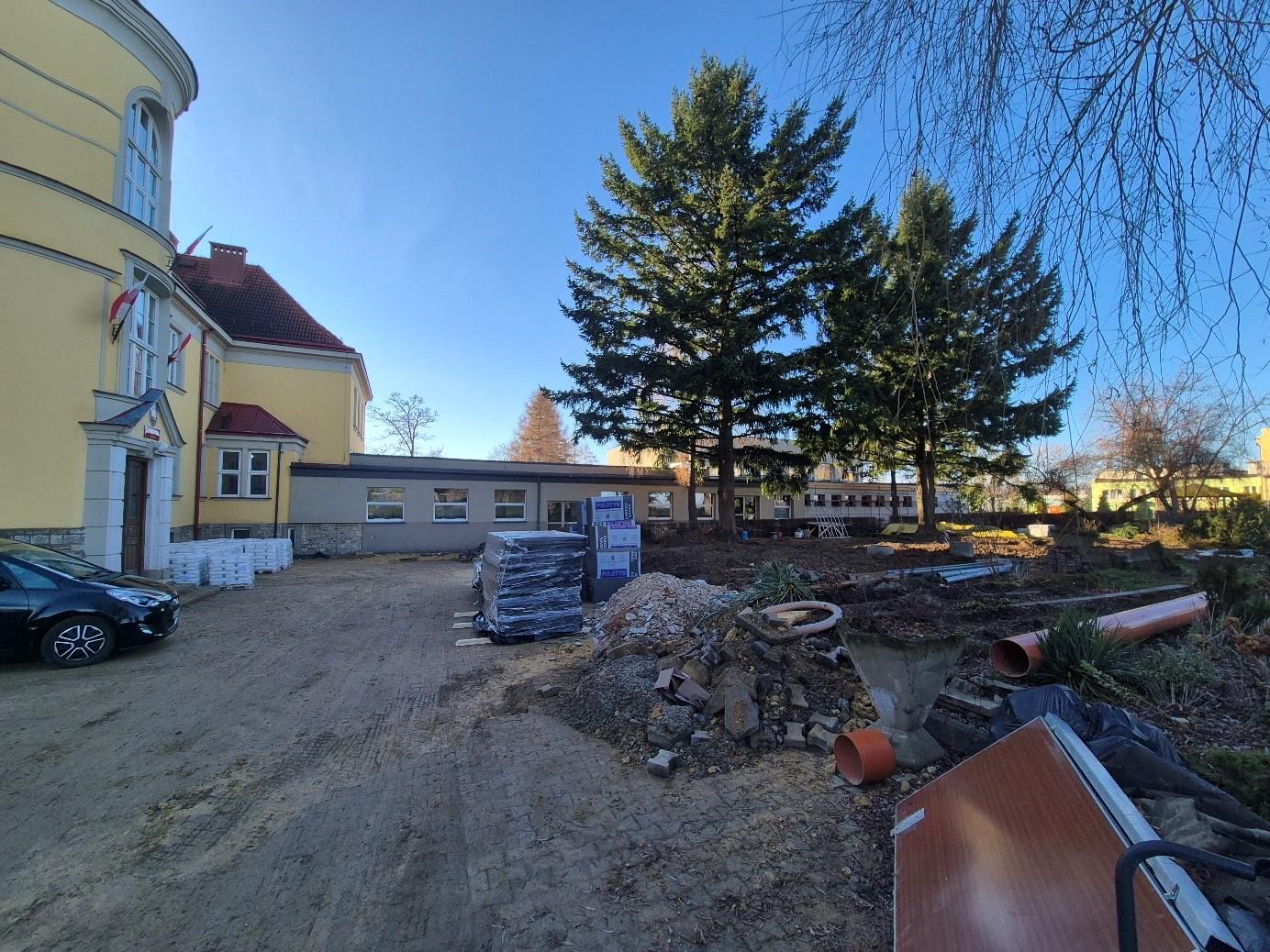 W okresie od października do listopada kontynuowane są prace związane z wykonaniem kanalizacji deszczowej, izolacji i ocieplenia fundamentów oraz ścian przyziemia, kontynuowane są również prace związane z zastosowaniem gruntowych pomp ciepła do ogrzewania budynku i prace odtworzeniowe boiska sportowego, gdzie wykonano odwierty pod gruntowe pompy ciepła.