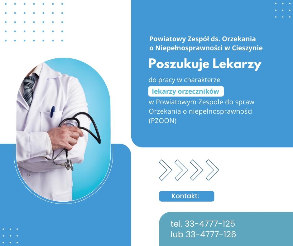 Przewodnicząca Powiatowego Zespołu ds. Orzekania o Niepełnosprawności w Cieszynie poszukuje Lekarzy do pracy w charakterze lekarzy orzeczników w Powiatowym Zespole do spraw Orzekania o niepełnosprawności (PZOON).