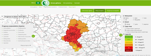 Prognoza na dzień 18.01.2021 r. dla stężeń średniodobowych pyłu PM10, przygotowana na podstawie prognozy zanieczyszczenia powietrza, wykonywanej przez Instytut Ochrony Środowiska - Państwowy Instytut Badawczy (IOŚ-PIB) dostępnej na portalu „Jakość powietrza” GIOŚ pod adresem http://powietrze.gios.gov.pl/pjp/airPollution |