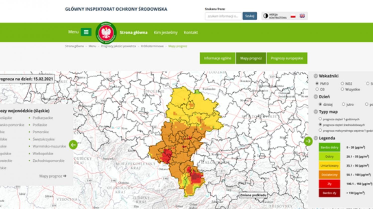 W dniu 15.02.2021r. na części obszaru woj. śląskiego istnieje ryzyko wystąpienia przekroczenia poziomu informowania dla pyłu zawieszonego PM10 (100 µg/m3). |