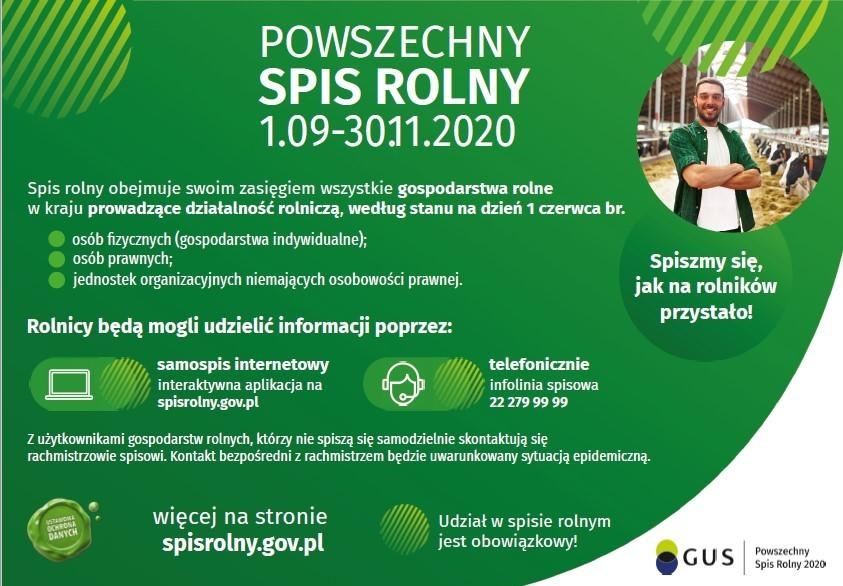 Powszechny Spis Rolny 2020 odbędzie się od 1 września do 30 listopada 2020 r., według stanu w dniu 1 czerwca 2020 r., na terenie całego kraju. Udział w spisie jest obowiązkowy.