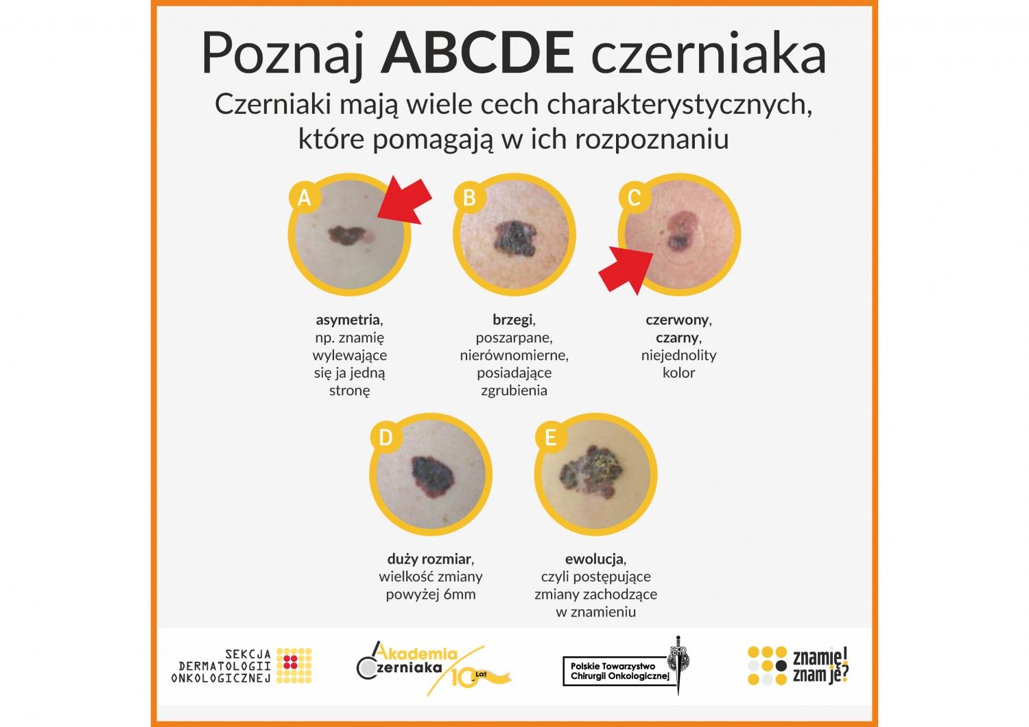 - E, jak ewolucja – znamię, które zmieniło się w krótkim czasie, powiększa się, unosi nad powierzchnię skóry, swędzi, pęka, piecze, wokół którego powstało kilka nowych znamion.